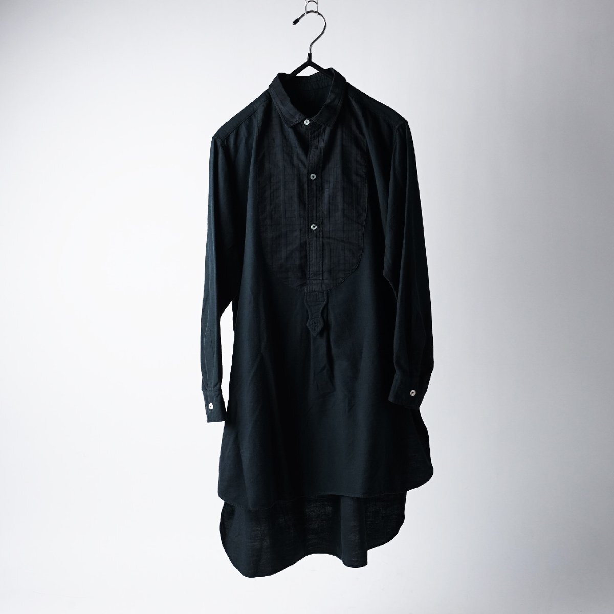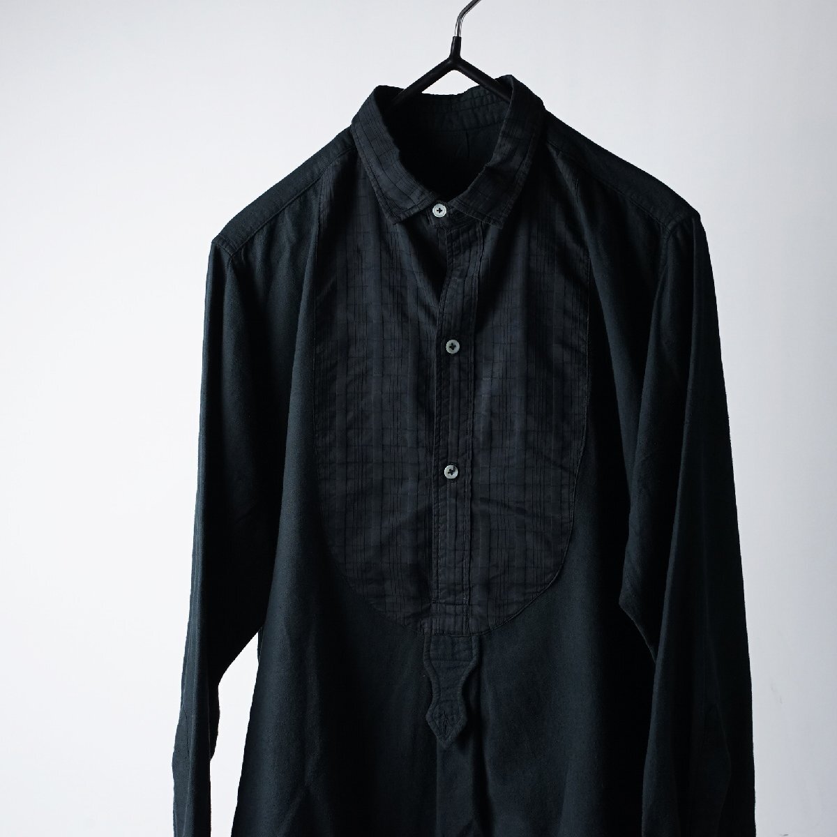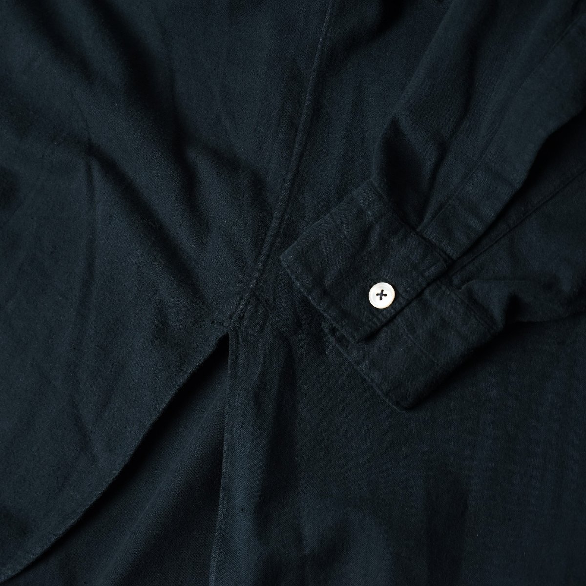 ○素材: フランスヴィンテージ  ドレスシャツです。当店でブラックカラーに後染めを施しました。裏側が毛足の短い起毛の柔らかいコットン素材です。 袖口と前上部はボタンで閉じるプルオーバタイプです。ボタン両脇は模様のある織の生地です。両脇裾にマチ付きスリットがあります。フランス購入品です。