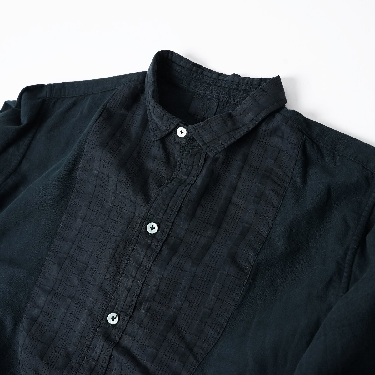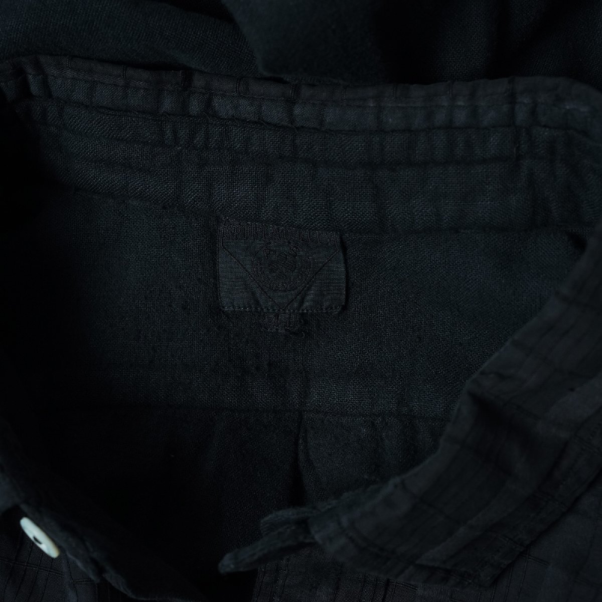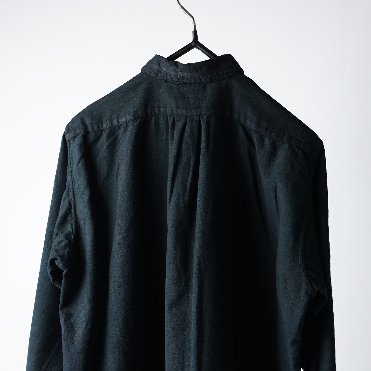 ○素材: フランスヴィンテージ  ドレスシャツです。当店でブラックカラーに後染めを施しました。裏側が毛足の短い起毛の柔らかいコットン素材です。 袖口と前上部はボタンで閉じるプルオーバタイプです。ボタン両脇は模様のある織の生地です。両脇裾にマチ付きスリットがあります。フランス購入品です。