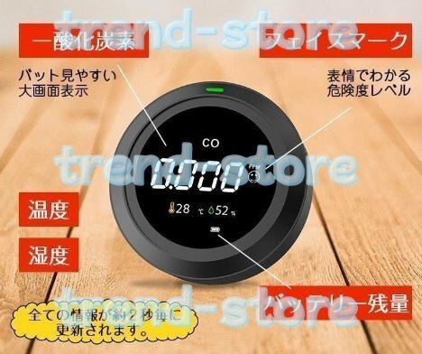 画面には気温/湿度/一酸化炭素濃度/バッテリー残量がデジタル形式で表示され、約2秒毎に更新されます。画面の表示はON/OFFが可能で就寝時なども邪魔になりません。