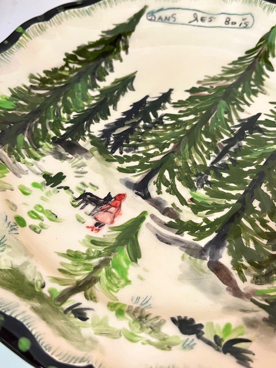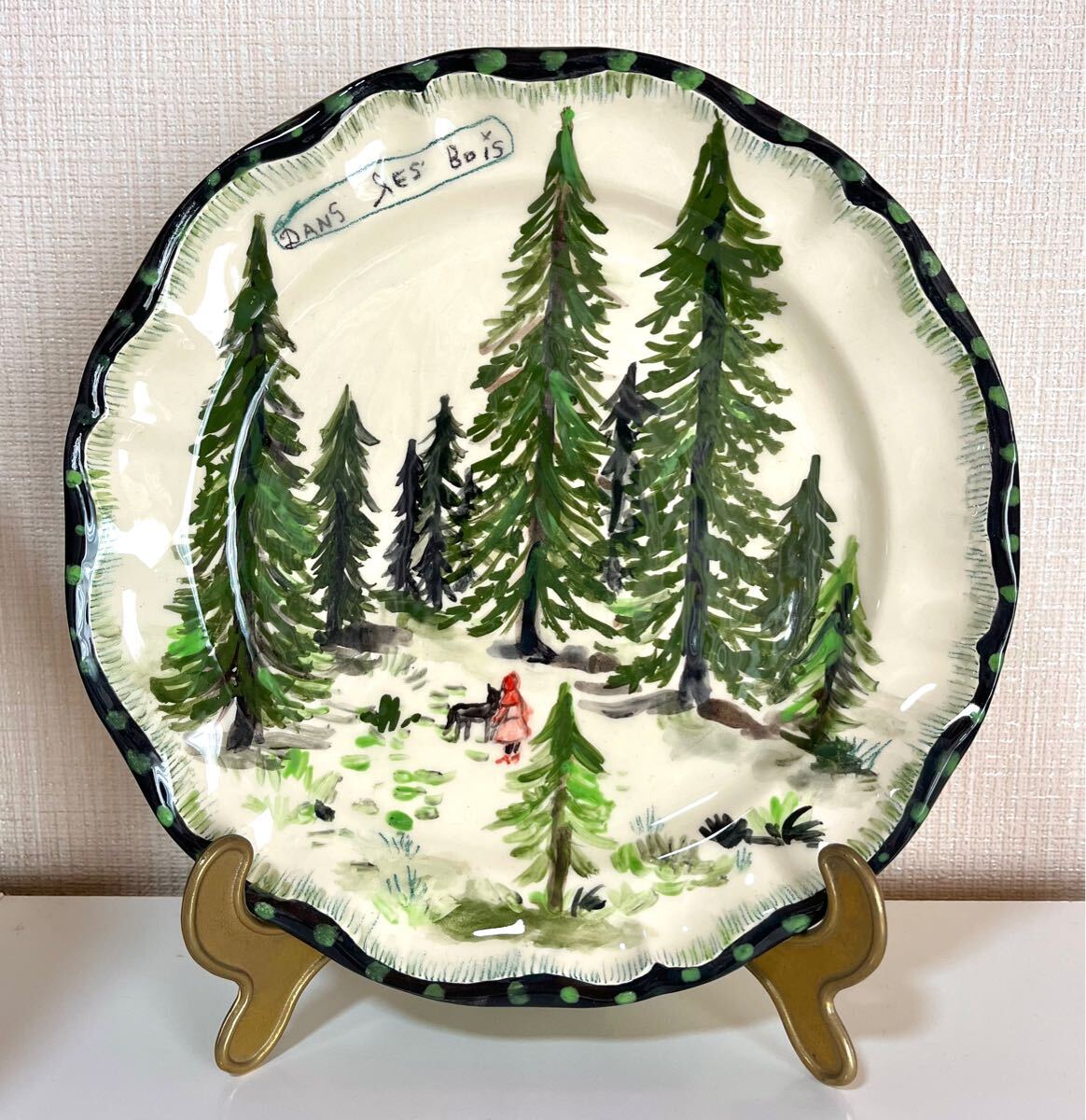 【ナタリーがハンドペイントした、1点もののセラミックプレート。深い森のなかにたたずむ、赤ずきんちゃんが描かれています。落ち着きあるグリーンがお部屋をシックに飾ってくれそう。】