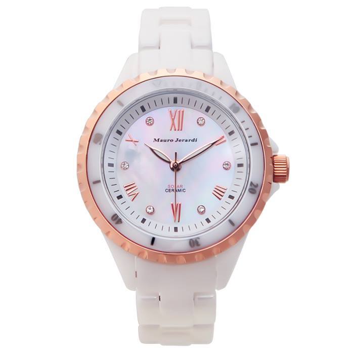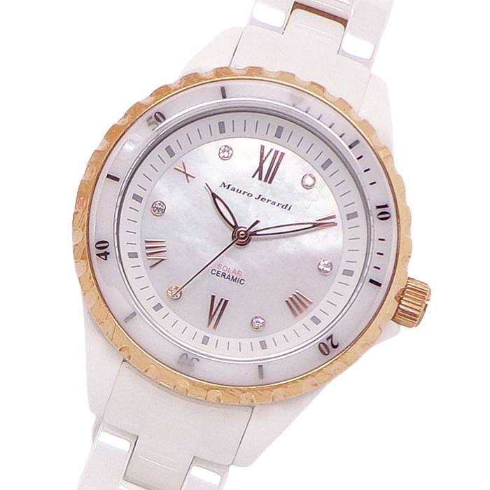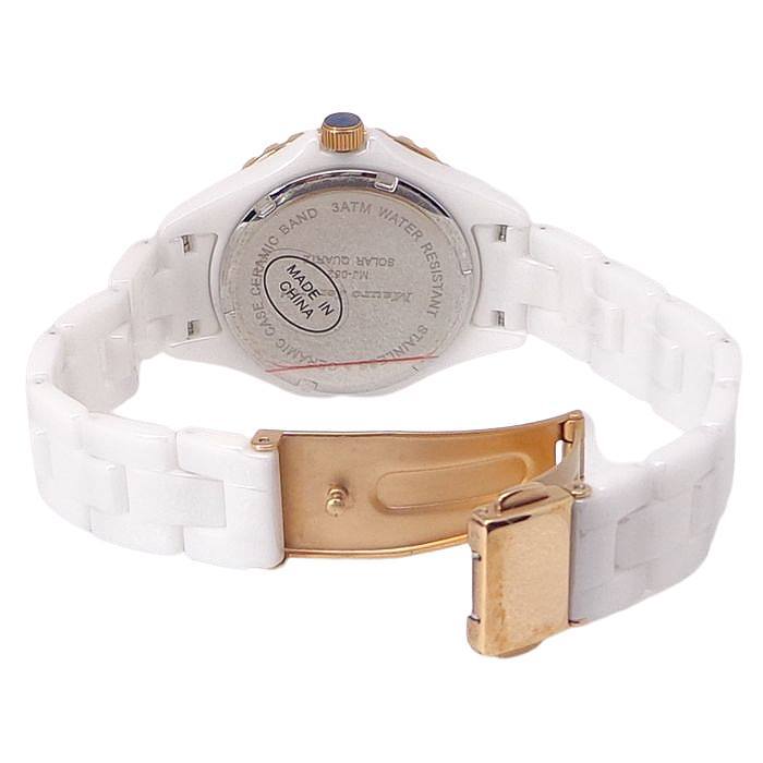 | フルセラミックのベルト、 セラミックケースがスタイリッシュなソーラーウォッチです!! 文字盤は白蝶貝を用い美しさが際立ちます。 電池交換が必要なく、フル充電時約4ヶ月動作します♪ ドレッシーでおしゃれかつ機能的なソーラーウォッチはビジネスやカジュアルなど、いろいろなシーンでお使いいただけます♪ |