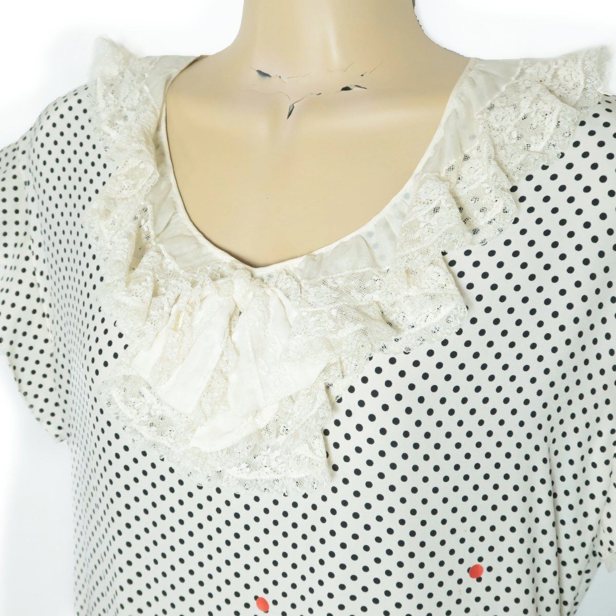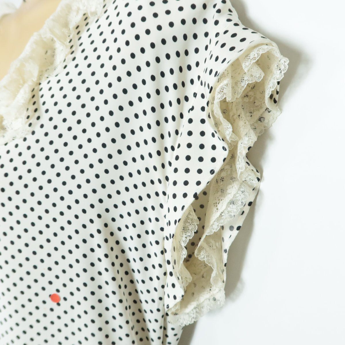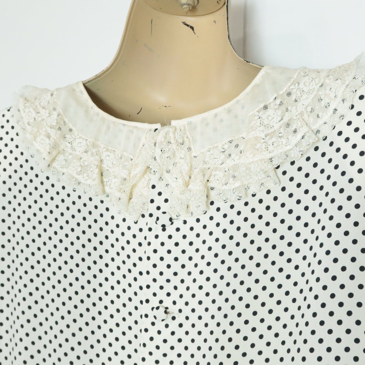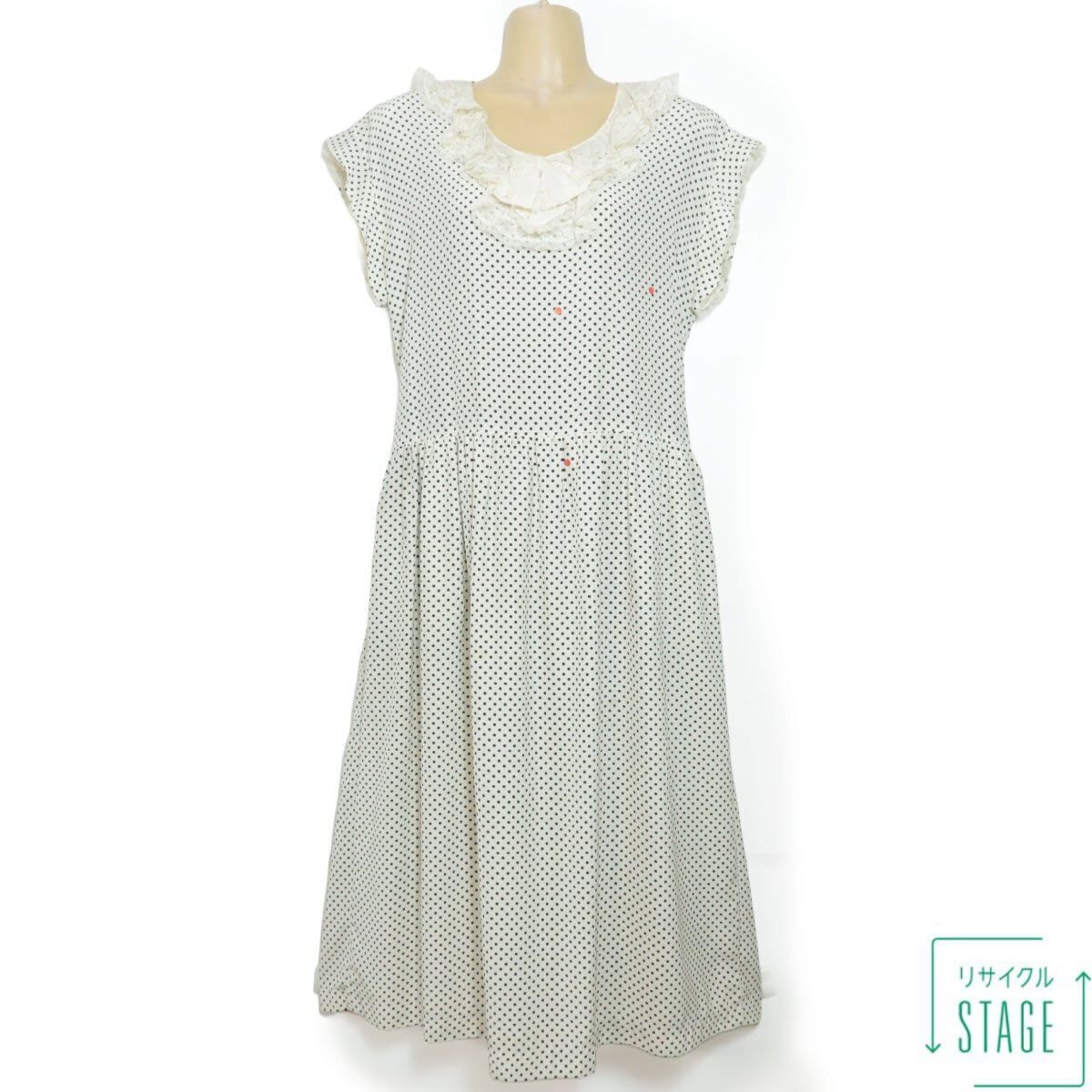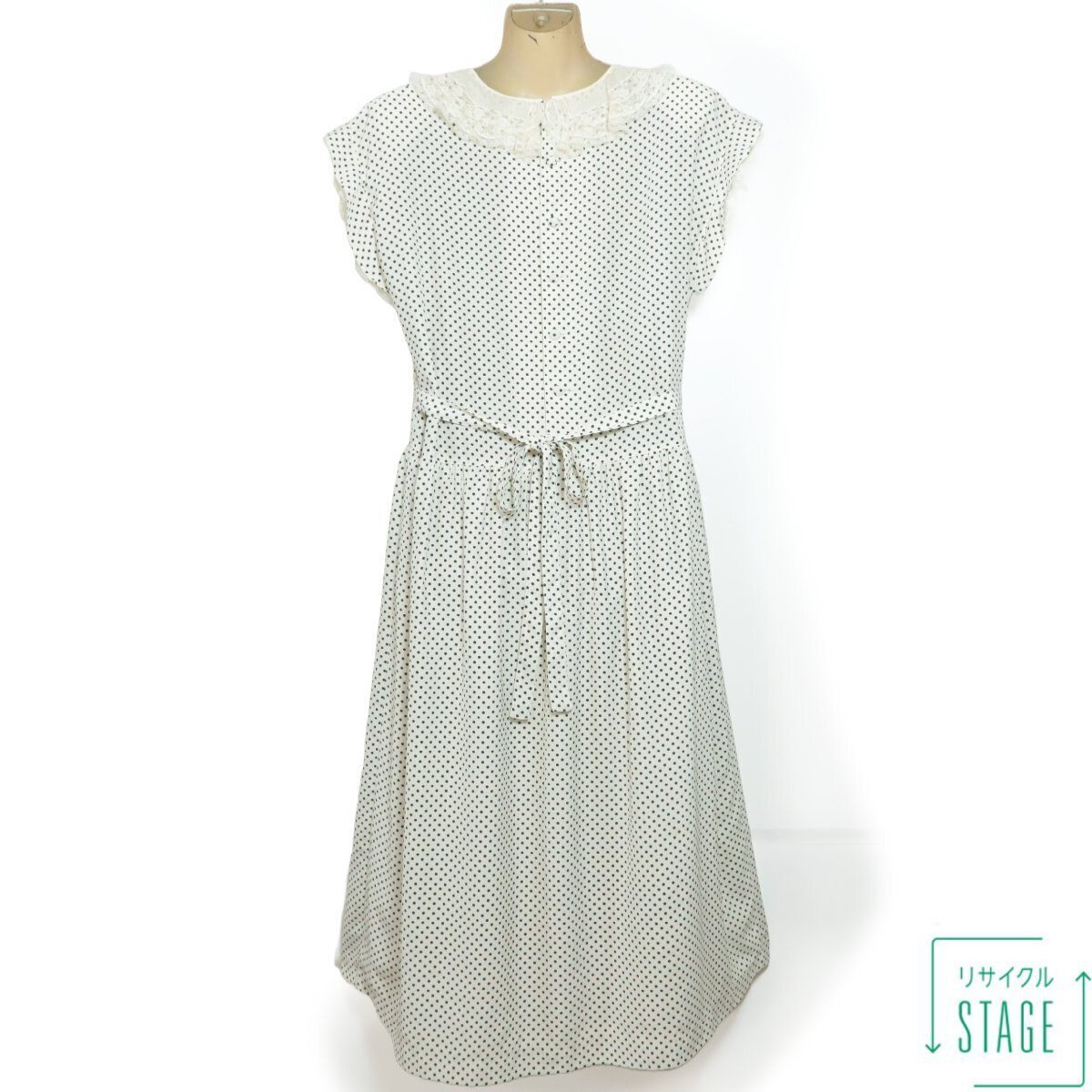 商品説明 | 【実寸約】肩幅48.5袖丈4バスト104着丈122(cm) 【サイズ表記】 なし。実寸をご参照くださいませ。 【素材】ポリエステル100% 【状態】普通の使用感のあるお品物 シミ数か所あり 【デザイン】 白系 ドットの総柄が大人可愛い一分袖ワンピースです。 レース付きのフリル襟がエレガント♪ リボン飾りと袖口にもレース付き♪ ウエストに結べるリボンベルトあり。 ボタンはバック上半身にのみです。 肩パッドあり。裏地あり 両サイドにポケット付き これ一枚でもレイヤードでもロマンティックコーデに大活躍するアイテム! |