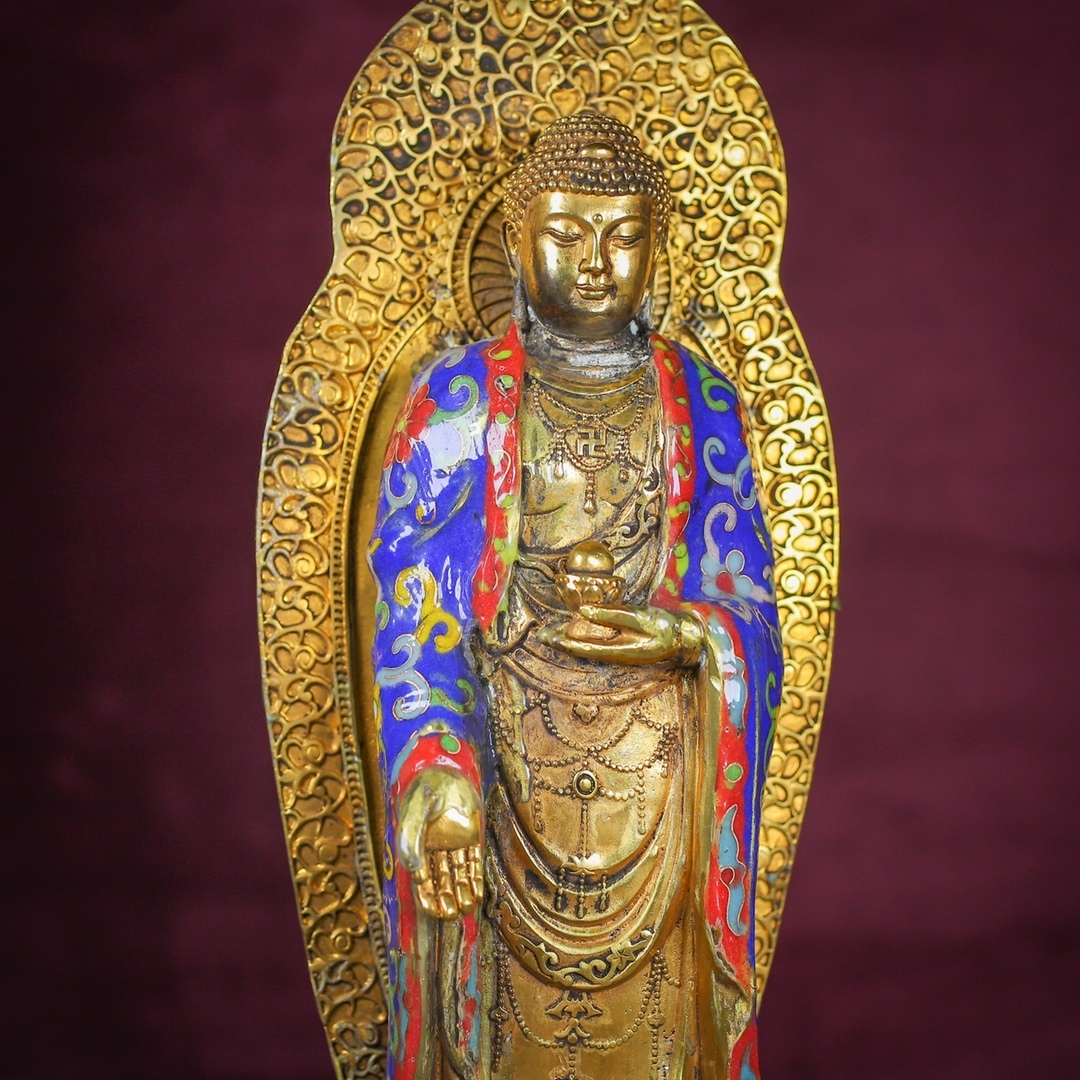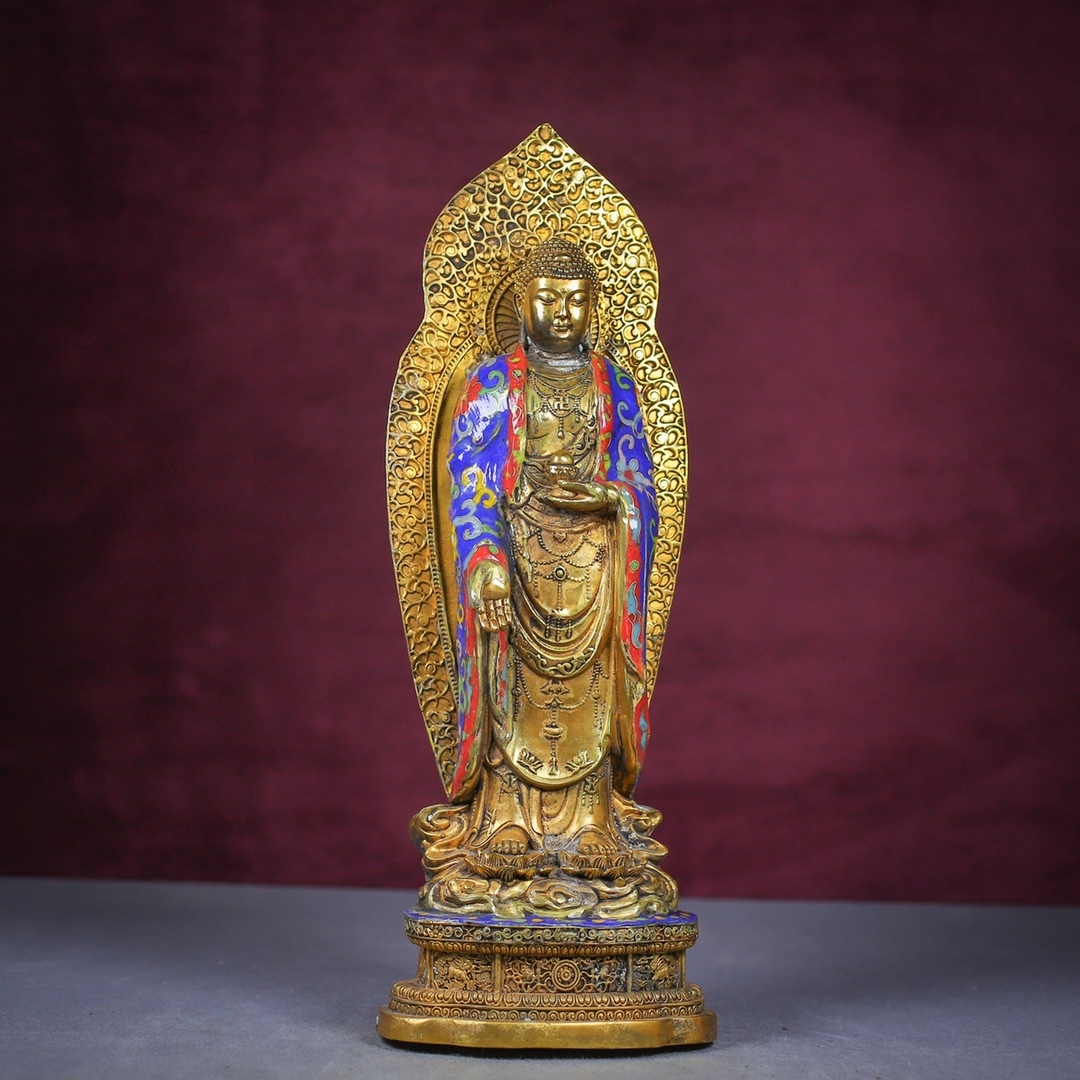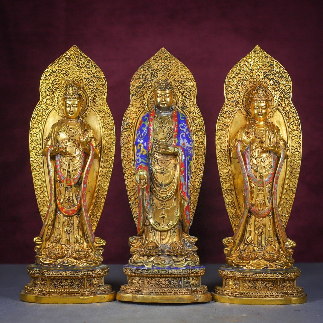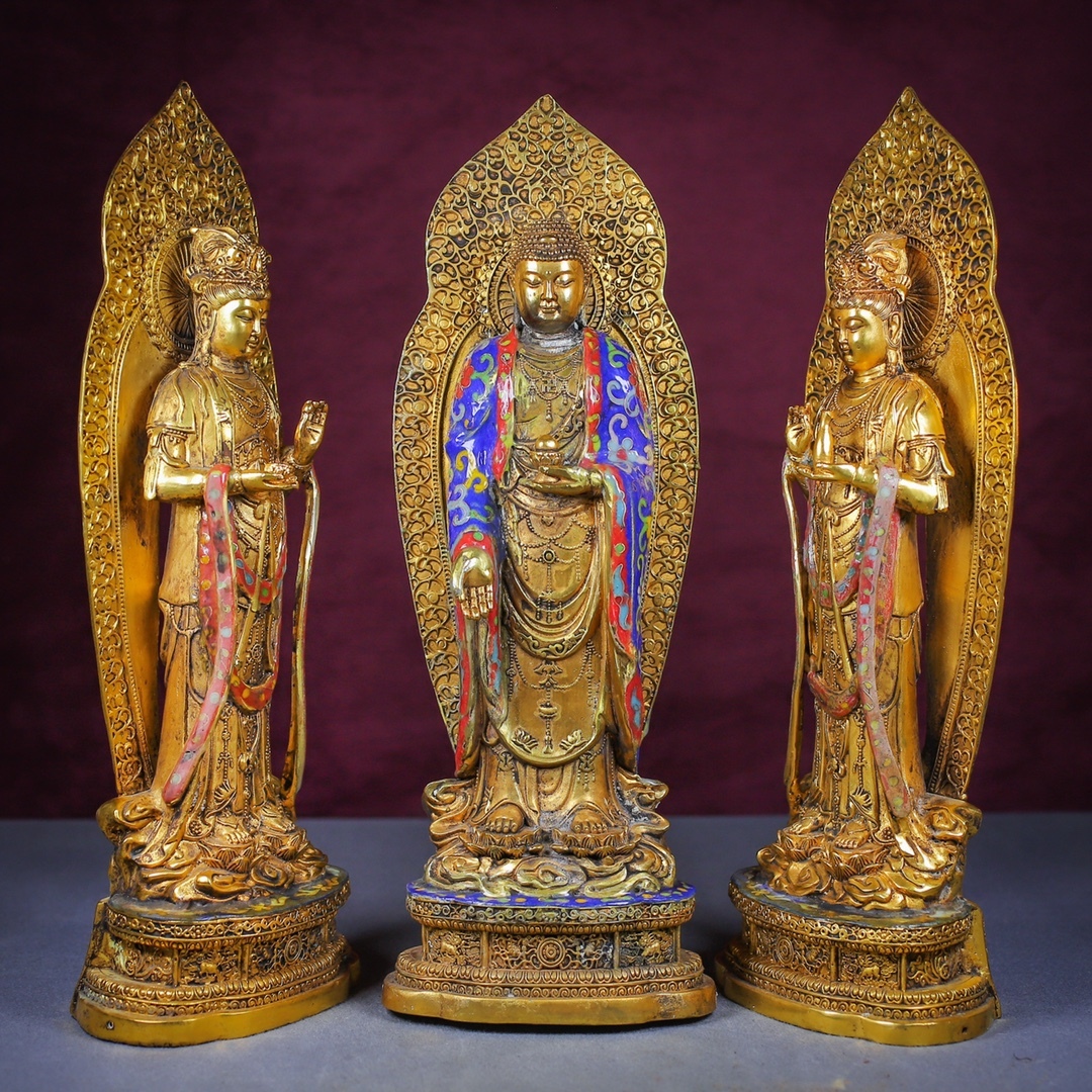 旧蔵 明 宣德年制 銅塗金 レリーフ景泰藍 撚糸エナメル工芸 西方三聖セット 仏像 奉納されていた 供養品 極細工 希少珍品 中国古玩 201-18