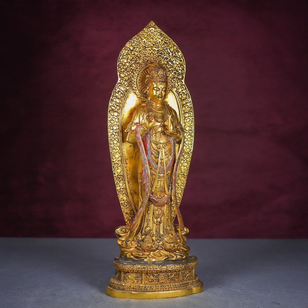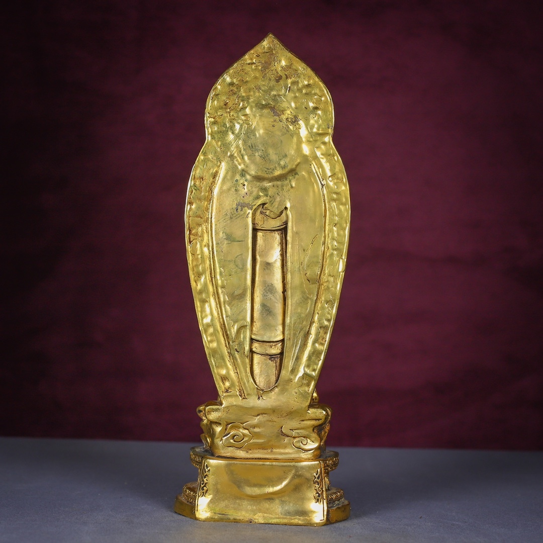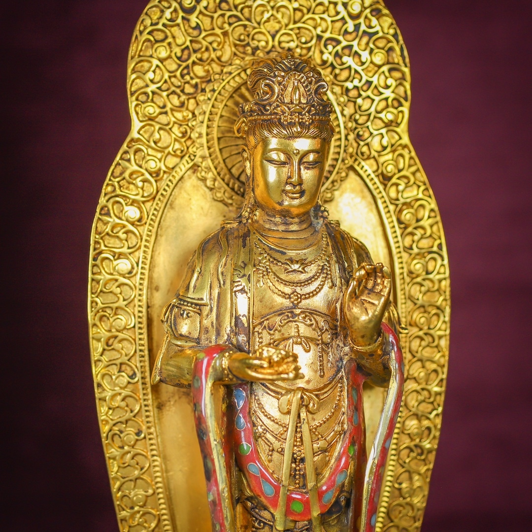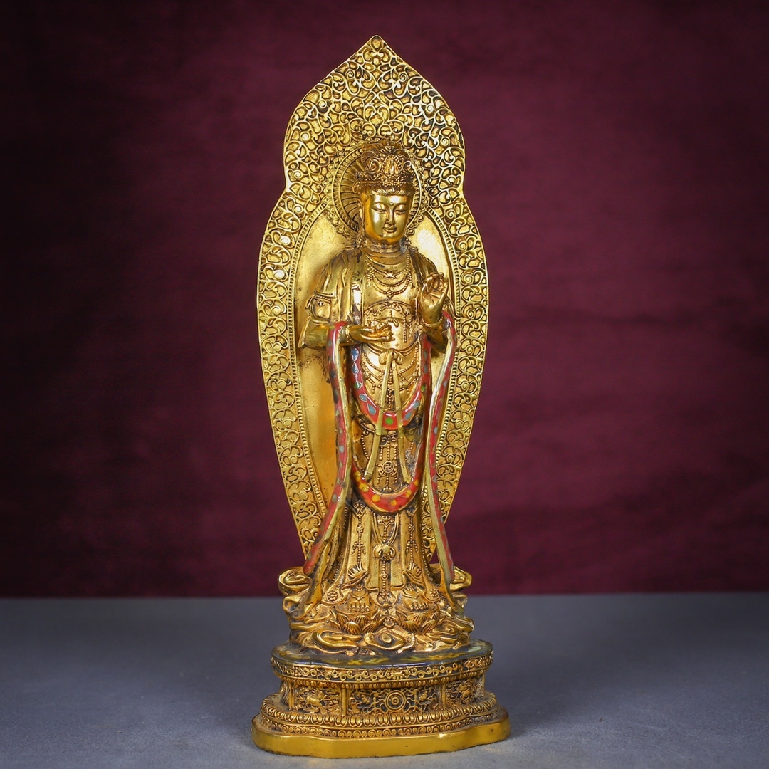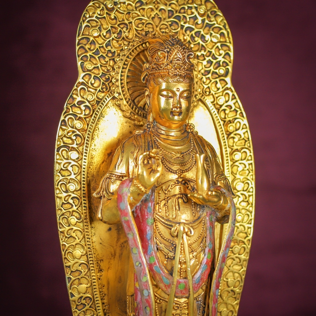 旧蔵 明 宣德年制 銅塗金 レリーフ景泰藍 撚糸エナメル工芸 西方三聖セット 仏像 奉納されていた 供養品 極細工 希少珍品 中国古玩 201-18
