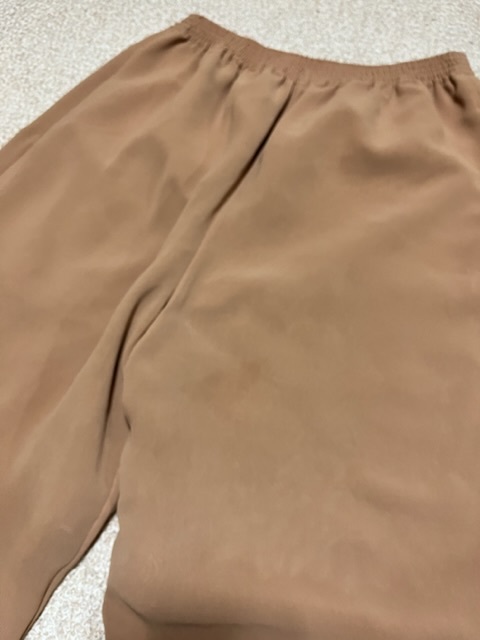 ウエストゴムで履き心地の良いパンツです。非常に形が良くスタイルがよく見える作りです。前側、後ろ膝あたりにうっすらシミがありますが、近くで見ないとわからないくらいです。しっかり裏地がついています。