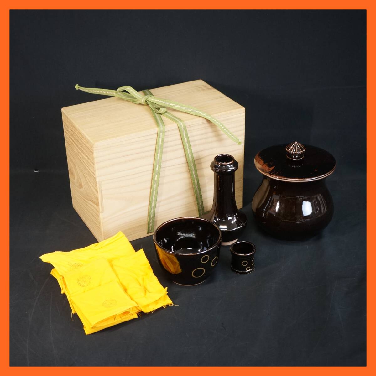 東ハ:【茶道具】京都 丹山窯 小峠葛芳造 石州好 水玉紋 皆具 石州流 十六代片桐貞光花押箱 水指 建水 杓立 蓋置 皆具一式 茶器 ★送料無料 |