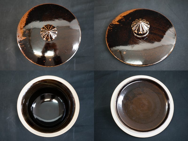 ■東ハ:【茶道具】京都 丹山窯 小峠葛芳造 石州好 水玉紋 皆具 石州流 十六代片桐貞光花押箱 水指 建水 杓立 蓋置 皆具一式 茶器 ★送料無料■ 京都 丹山窯 葛芳造「 石州好 水玉紋 皆具 」石州流 十六代片桐貞光花押箱 共箱付きになります。 【小峠葛芳(ことげ かつよし) 略 歴】 1946年(昭和21)~ 兵庫県姫路市出身。 叔父に当たる5代宮川香斎及び益子の人間国宝島岡達三に師事。 1974年、京都宇治炭山に丹山窯を築き独立。 以後、日本工芸会近畿支部展、京都府工芸美術展、日本伝統工芸展などを中心に入選を重ねる。 1981年に日本工芸会正会員に推挙。 そのほか大阪、京都、東京などで個展を開催。 三嶋手や伊賀写しをもっとも得意とするが赤絵、祥瑞、染付、仁清写など幅広く手掛け 茶陶全般に秀作を残す。 陶印は「葛芳造」「丹山」 「丹山窯」 丸印「丹山」 「丹」 「丹山窯」 など 【サイズ】 ・水指 (約)高さ22.0 × 幅17.0 ×奥行17.0 cm ・建水 (約)高さ9.8 × 幅13.4 ×奥行13.4 cm ・杓立 (約)高さ20.2 × 幅9.8 ×奥行9.8 cm ・蓋置 (約)高さ5.0 × 幅5.1 ×奥行5.1 cm 【コンディション】 中古のお品となります。 付属品は写真にあるものが全てです。 経年・使用に伴うヨゴレ・キズ、共箱にシミヨゴレ・欠けなどがございます。 当店では、古いものを扱っておりますため、時代経過による汚れ・スレなどがございます。 新品(完全品)をお求めの方は、ご入札をお控えください。 状態につきまして、不明な点などございましたら商品説明欄の質問欄より事前にお気軽にご質問ください。 画像をよくご覧になられお客様のご納得の上、責任を負える範囲でのご入札をお願い致します。 ■商品画像について■ ご使用モニター環境などによっては、多少色合いなどが異なって見える場合がございます。 予めご了承いただけますようお願い申し上げます。 商品画像をよくご確認の上、ご参加ください。 [管理No.25011666VN] |