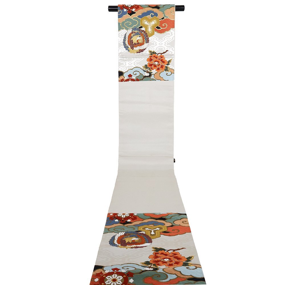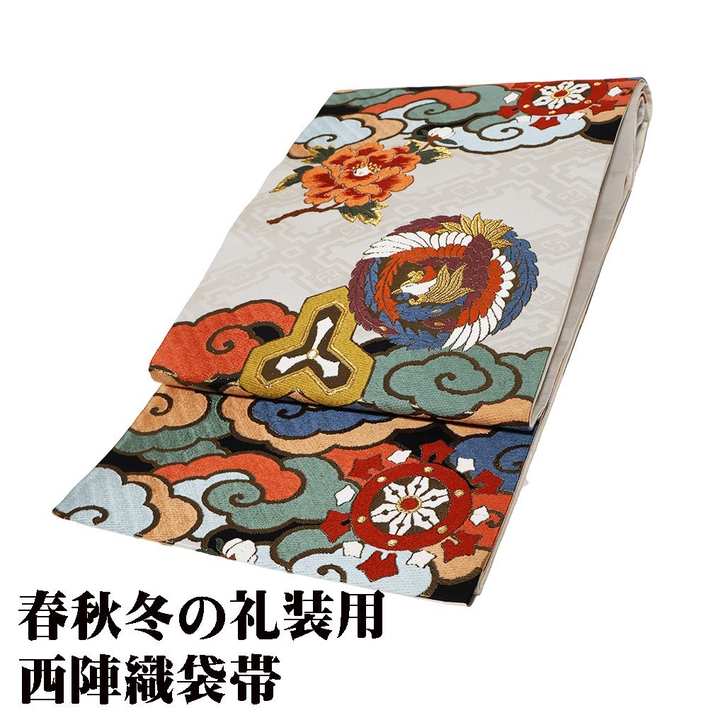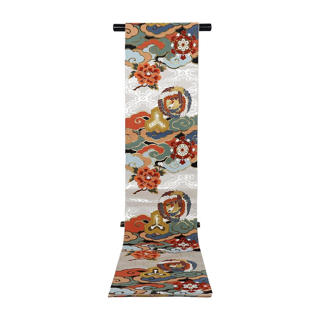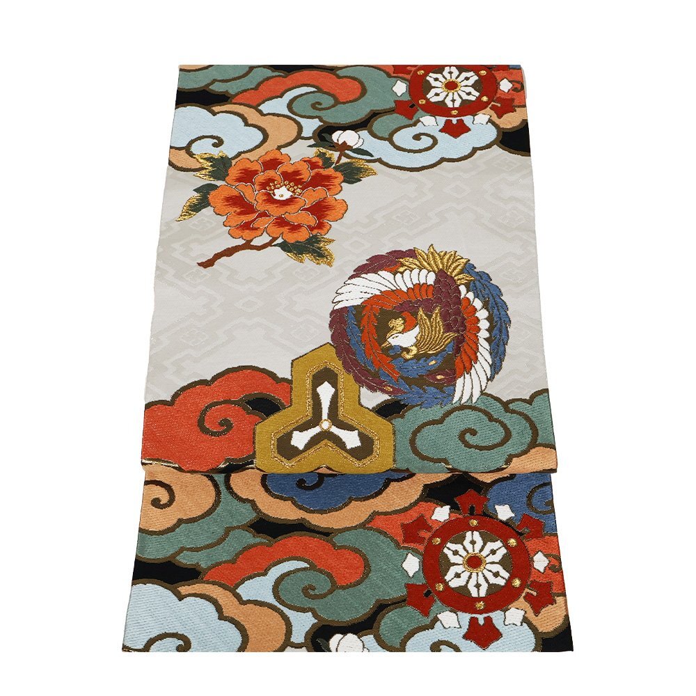 | 西陣織袋帯 ライトグレー・銀箔・菱文地 鳳凰・毘沙門亀甲・車輪文・牡丹・雲 仕立て上がり |