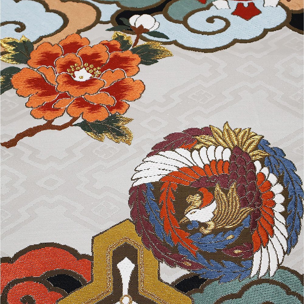 西陣織袋帯 ライトグレー・銀箔・菱文地 鳳凰・毘沙門亀甲・車輪文・牡丹・雲 (写真では上手く色が出ない場合があります。ご了承下さい) ※お使いのディスプレイの種類や設定の差により 実物の色と画像の色が少々異なることもございます。 |