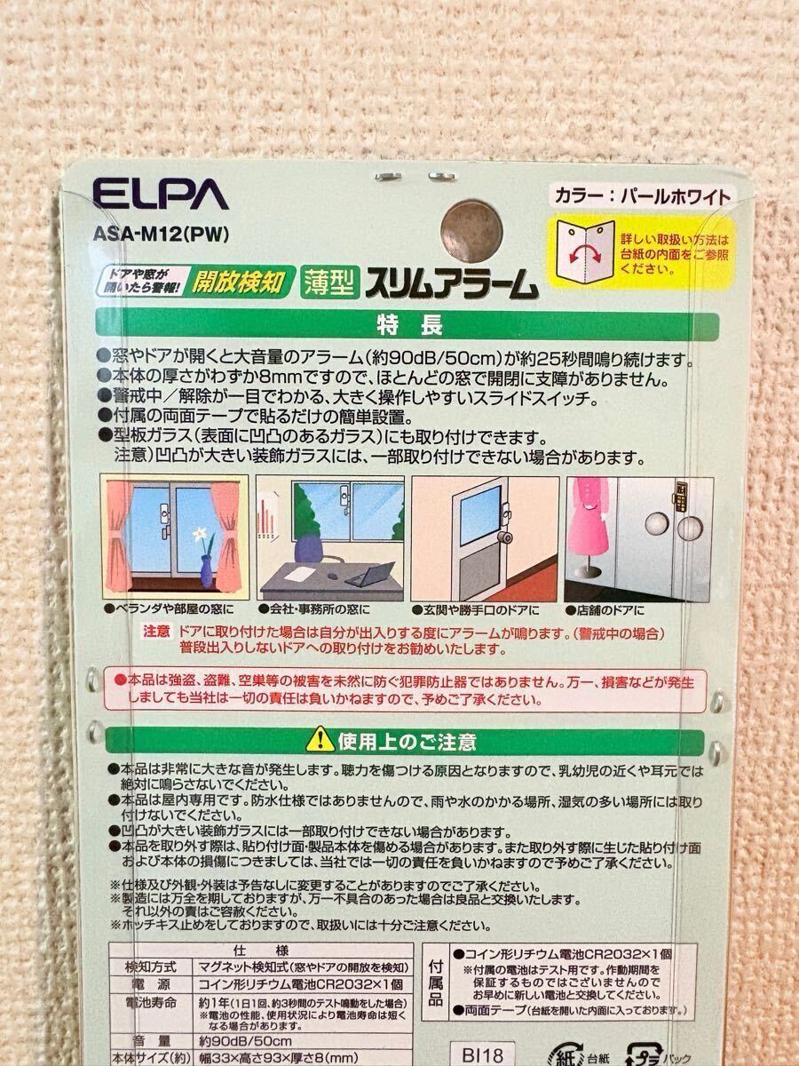 開放検知機能: 窓やドアが不正に開けられた際に、90デシベルの大音量アラームで警告し、不審者を威嚇します。