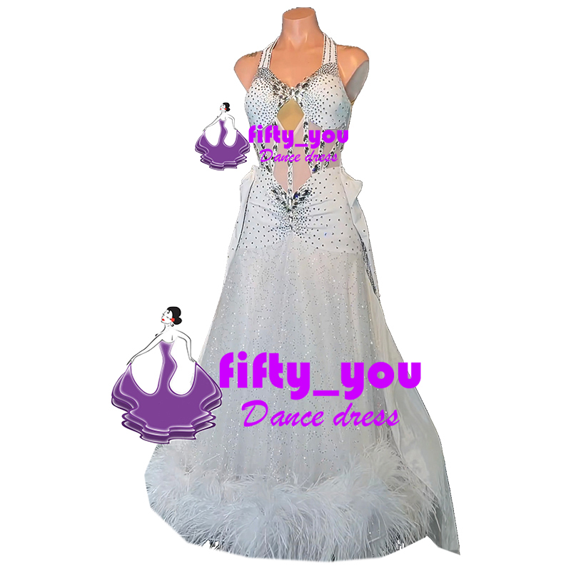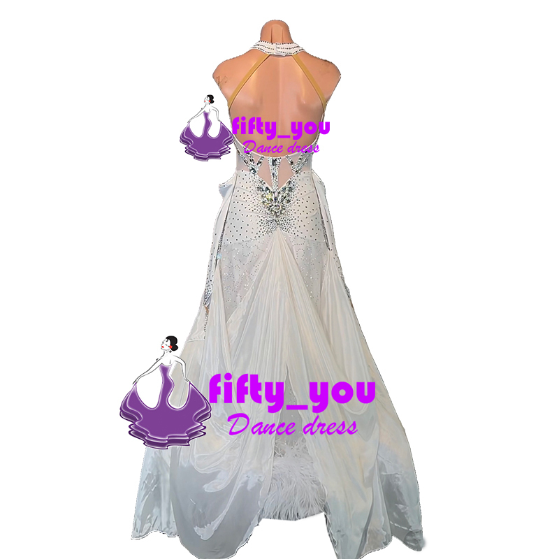 新品fifty_youレディース社交ダンス衣装 セミオーダー モダン競技ドレス  スタンダード高級ドレス キラキラスカート 羽飾り 白色