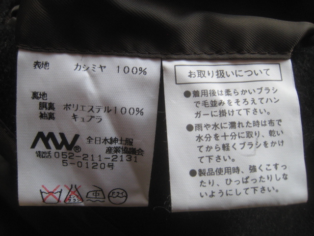 表地 カシミヤ100%、身頃裏地 ポリエステル100%、袖裏地 キュプラ100%