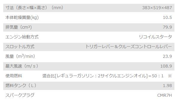 ・使用燃料:混合比[レギュラーガソリン:2サイクルエンジンオイル]=50:1 ※