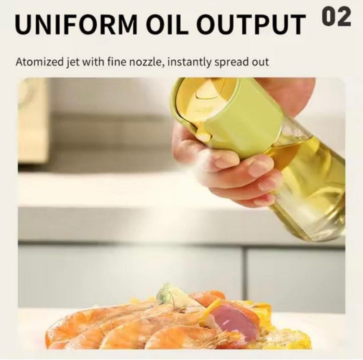 このオイルディスペンサーは、スプレーと注ぎの 2 つのモードの利便性を備えており、広角、微細ミスト、安定したオイルの中から選択して、オイル使用量を正確に制御できます。
