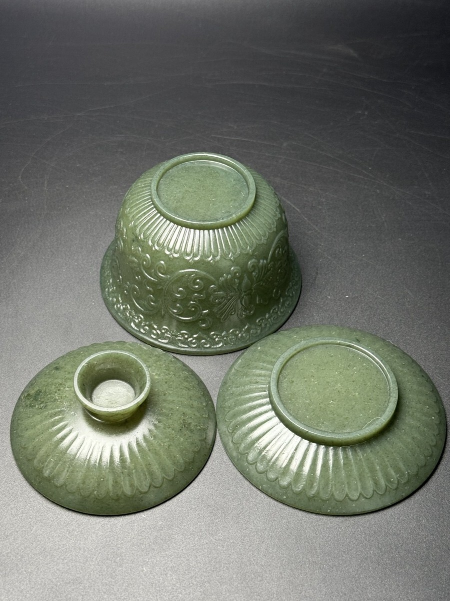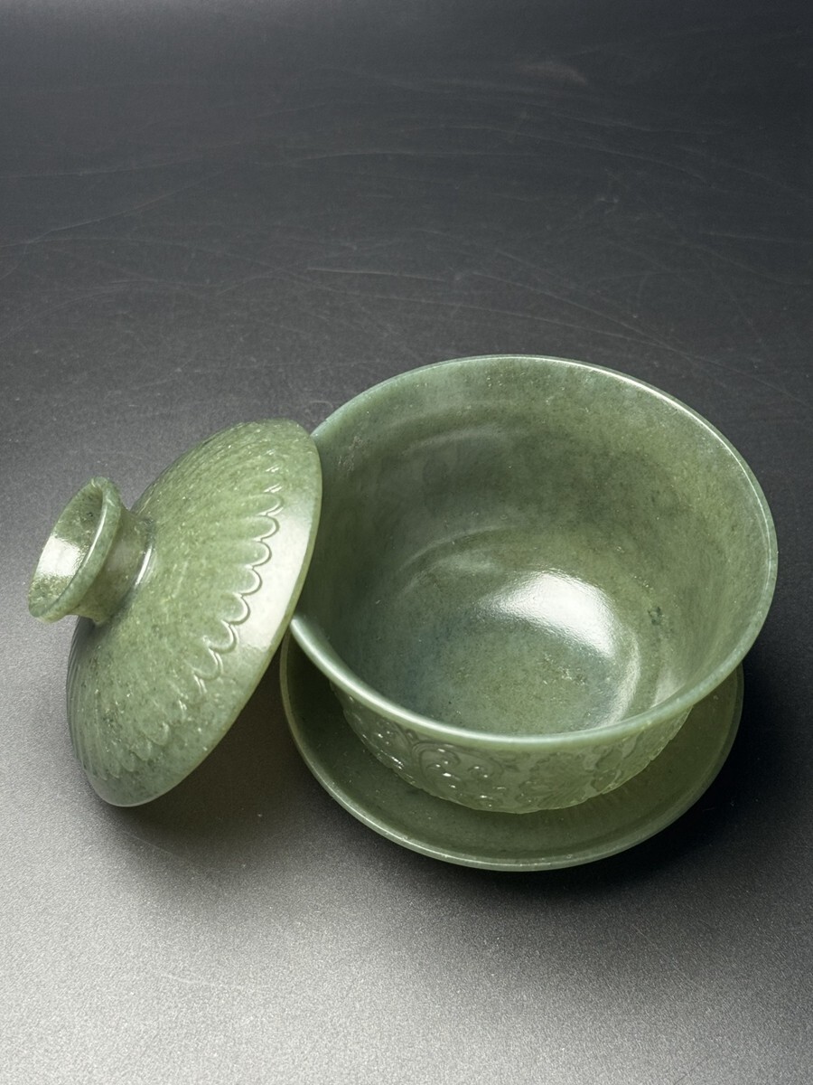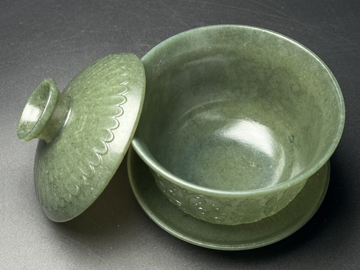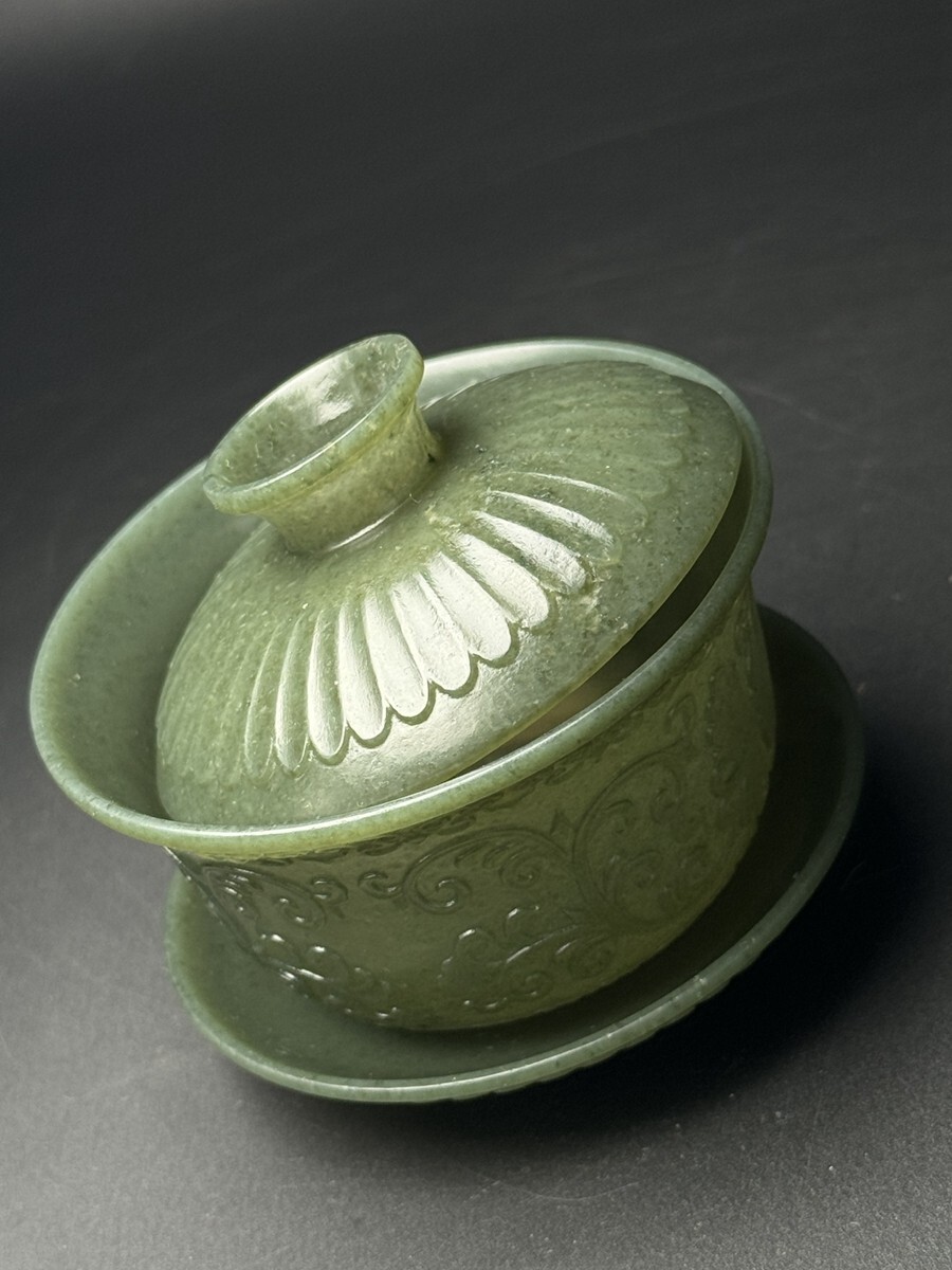 清時代 和田玉 青玉彫 茶盞【仁】極細工 手彫り 置物擺件 古賞物 蔵出