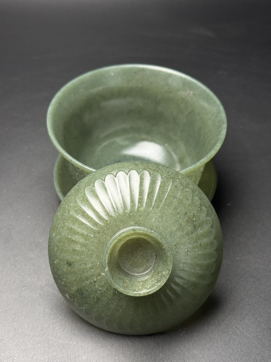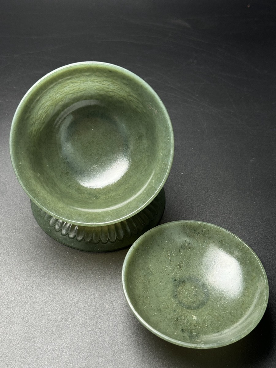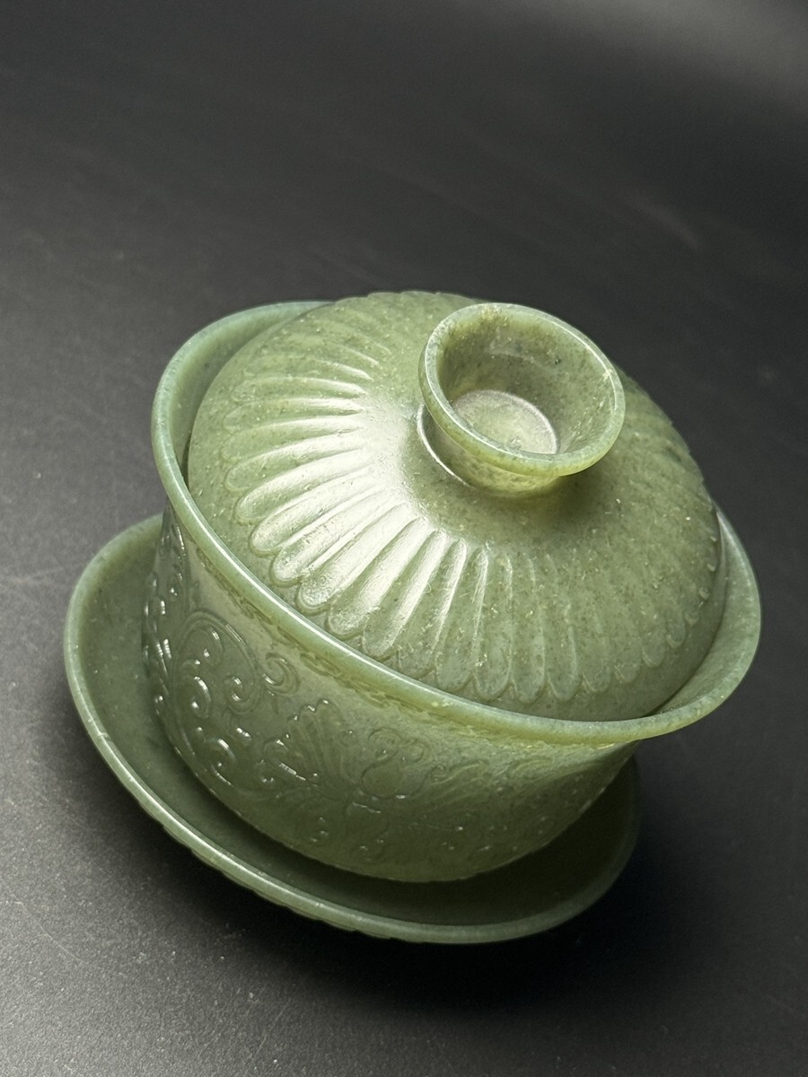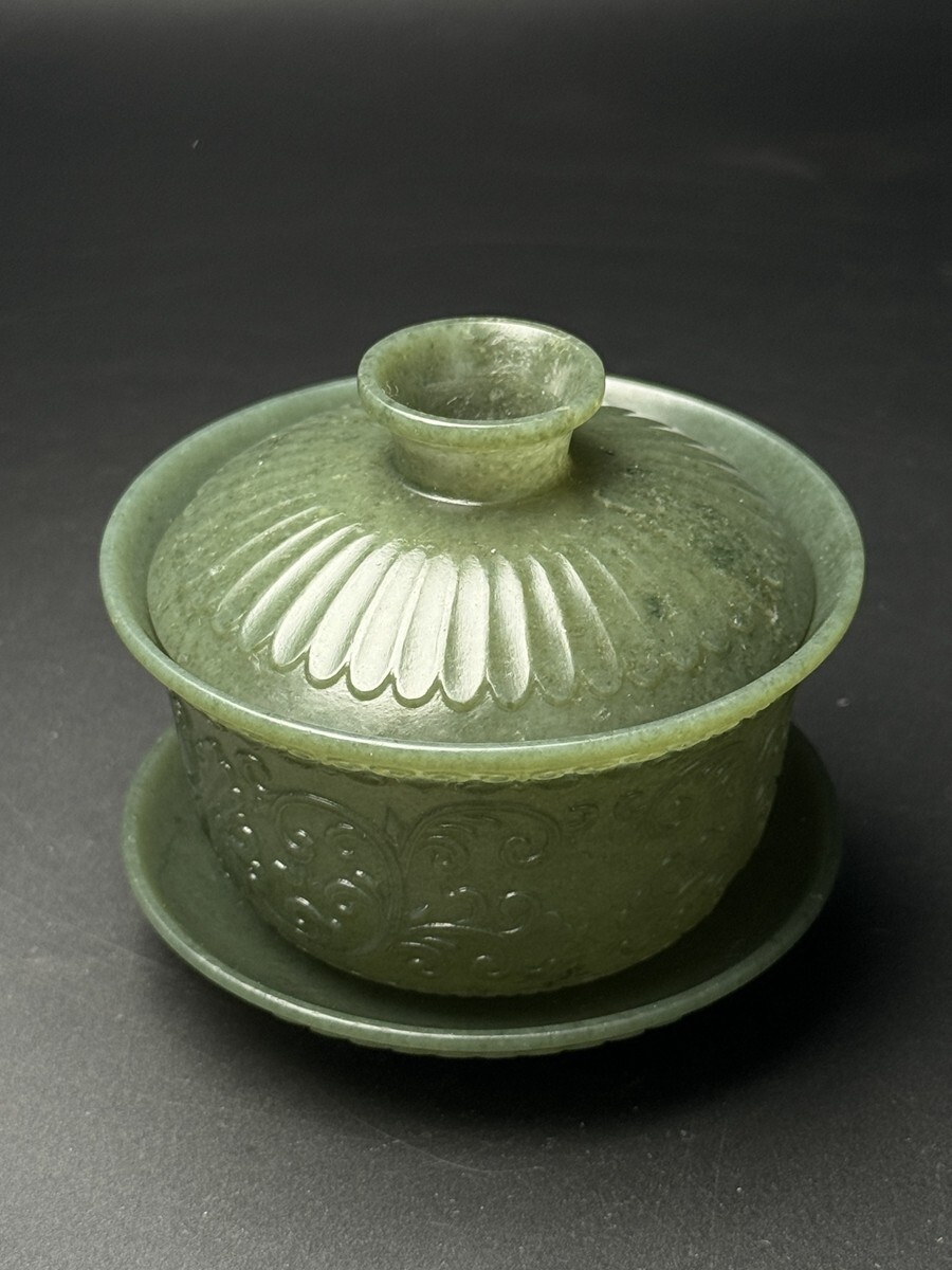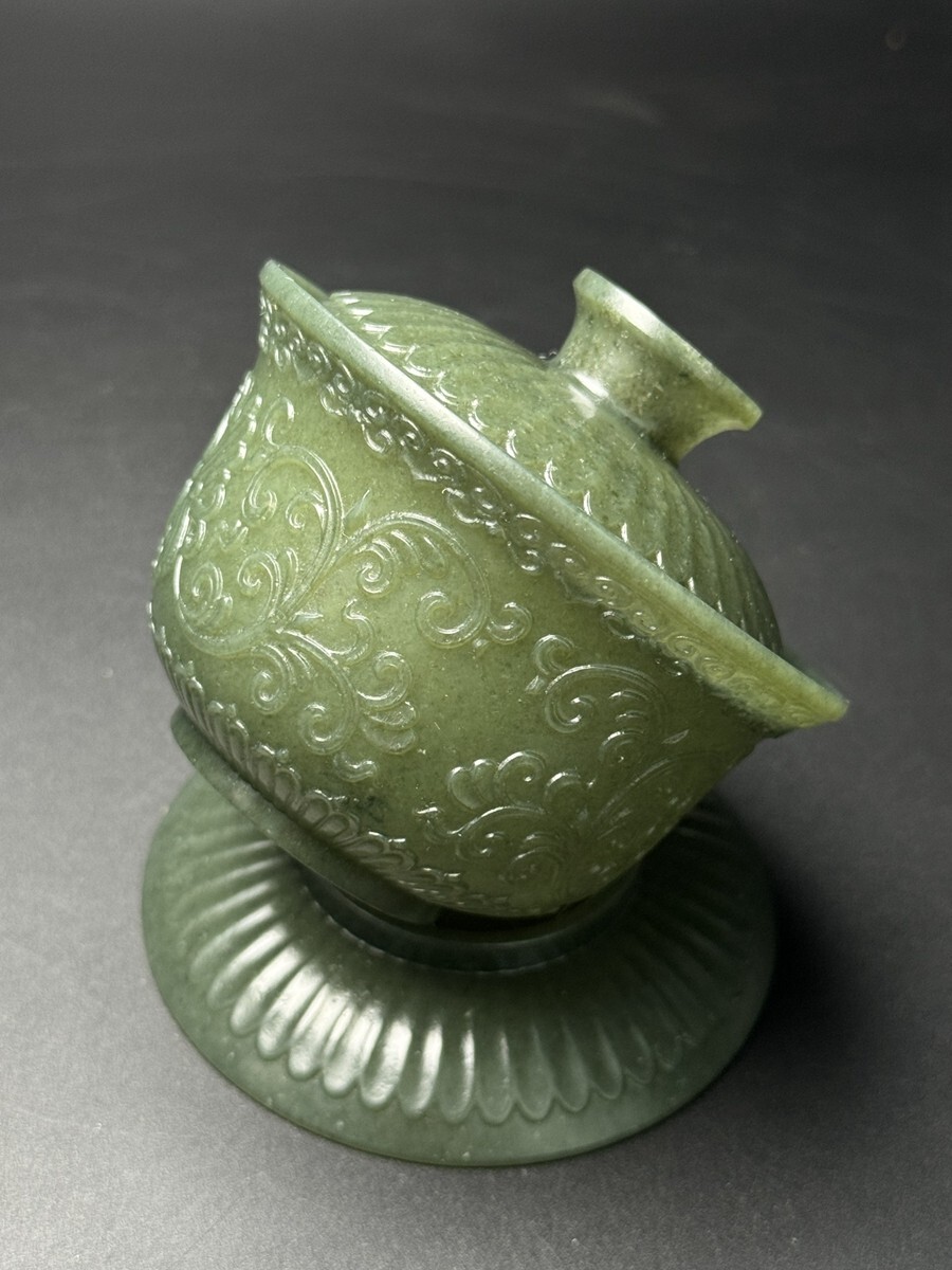 清時代 和田玉 青玉彫 茶盞【仁】極細工 手彫り 置物擺件 古賞物 蔵出