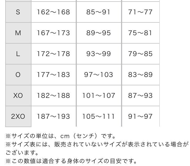 胸回り:S/100cm、M/104cm、L/108cm、O/112cm、XO/116cm、2XO/120cm