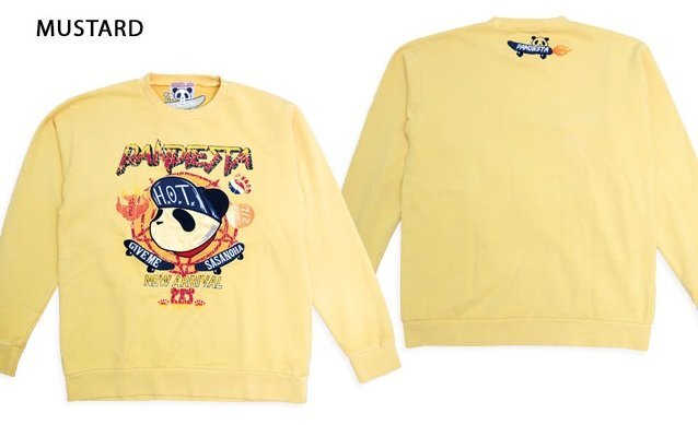 和柄ブランド【錦】の姉妹ブランドとして誕生した、お茶目なパンダをモチーフとした【PANDIESTA JAPAN】より「スケートパンダピグメントスウェット(564561)」のご紹介です。 今や、錦の定番モチーフとなった「錦PANDA」!! ピグメント加工を行うことでヴィンテージライクな風合いを演出した、スウェットトレーナーです。 着はじめから長年愛用しているような色合いで、新しくも懐かしさを感じる一着に仕上げています。 今回のモチーフはスケボー。 ストリート調にデザインされており、ピグメント加工との相性も抜群です。 フロントにはストレートキャップを被ったパンディエスタのアイコンを刺繍。 スケートボードには刺繍を使用し、背景のロゴはひび割れプリントで表現しました。 背中にはスケボーとパンダフェイスを、袖口にはフットスタンプを、それぞれワンポイントで刺繍しました。 ボディーには裏毛タイプのスウェット生地を採用。 襟元、袖口、裾にはリブを配し、野暮ったさを軽減しました。 | |||||||||||||||||||||||||