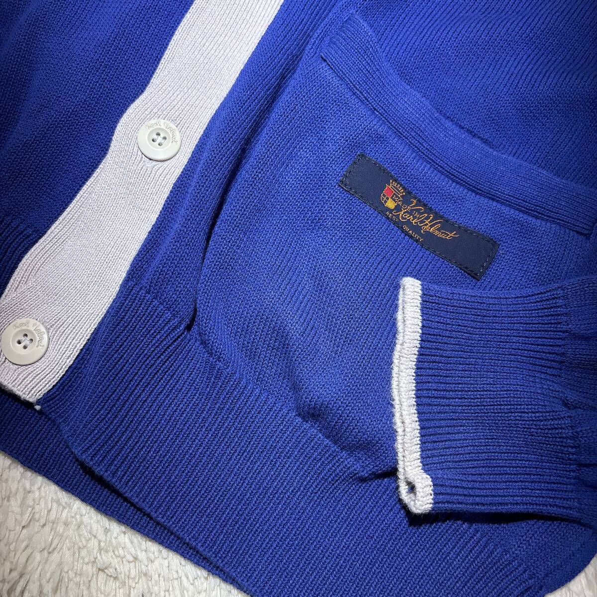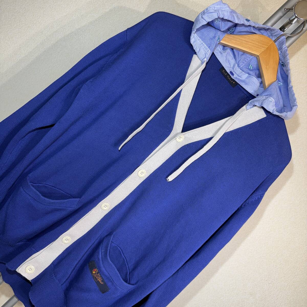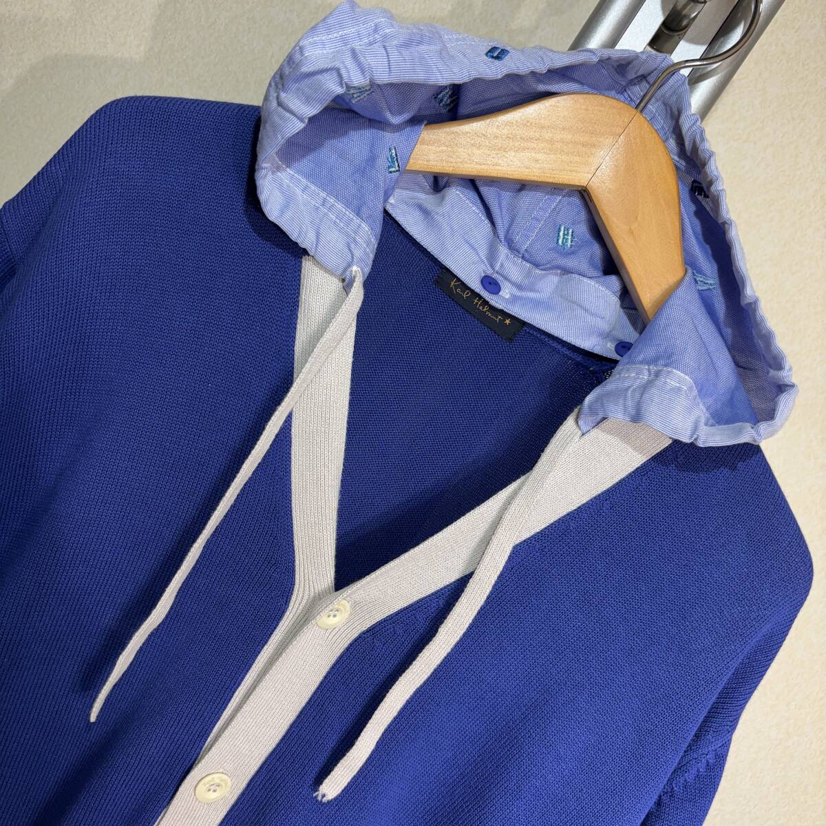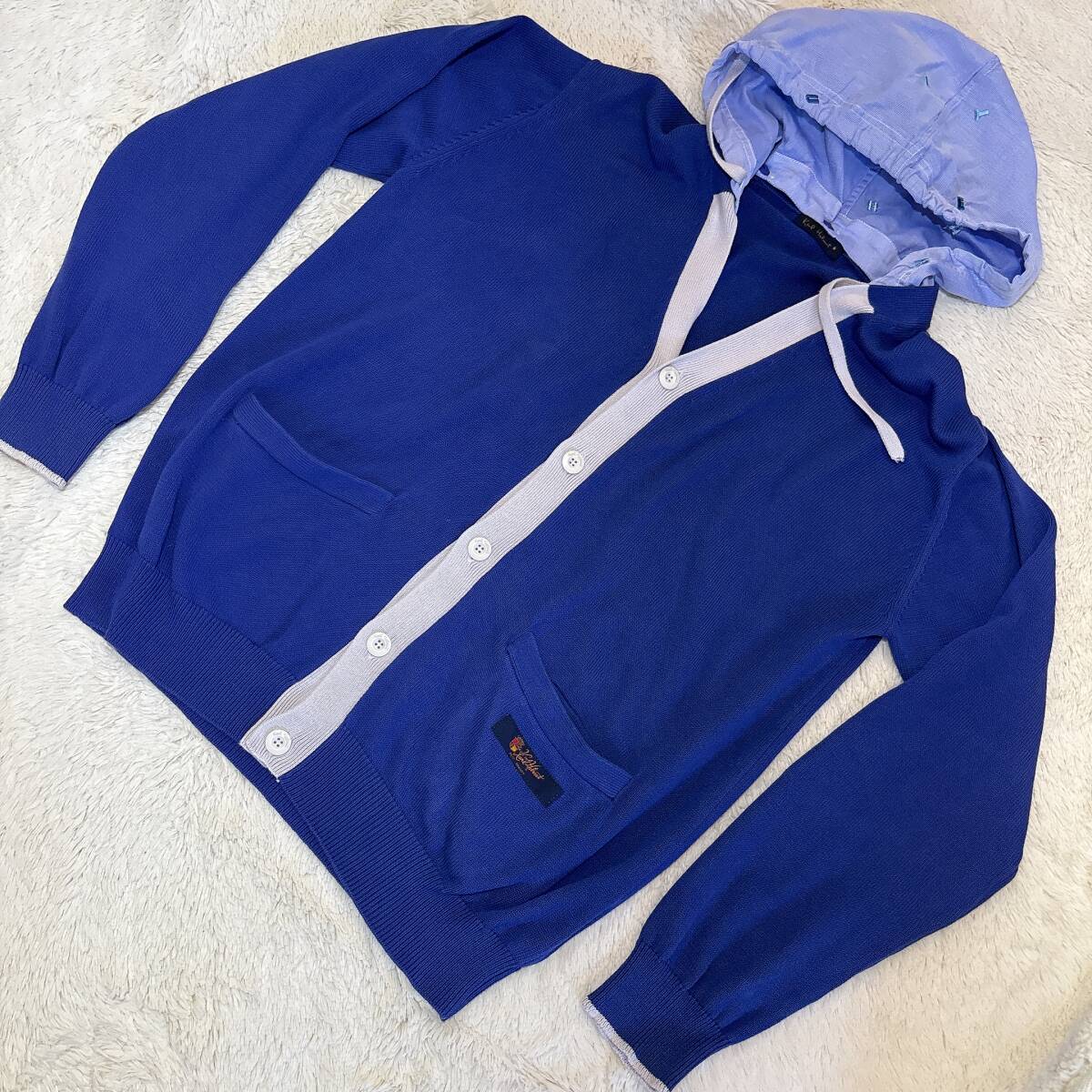X382美品!■カールヘルム★青紺*アイボリー/ロゴ刺繍入フード★カーディガン■L | ||||||||||||||||||||