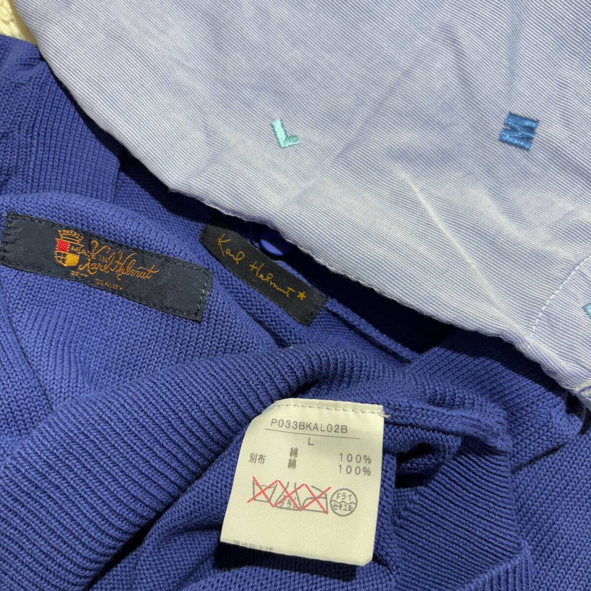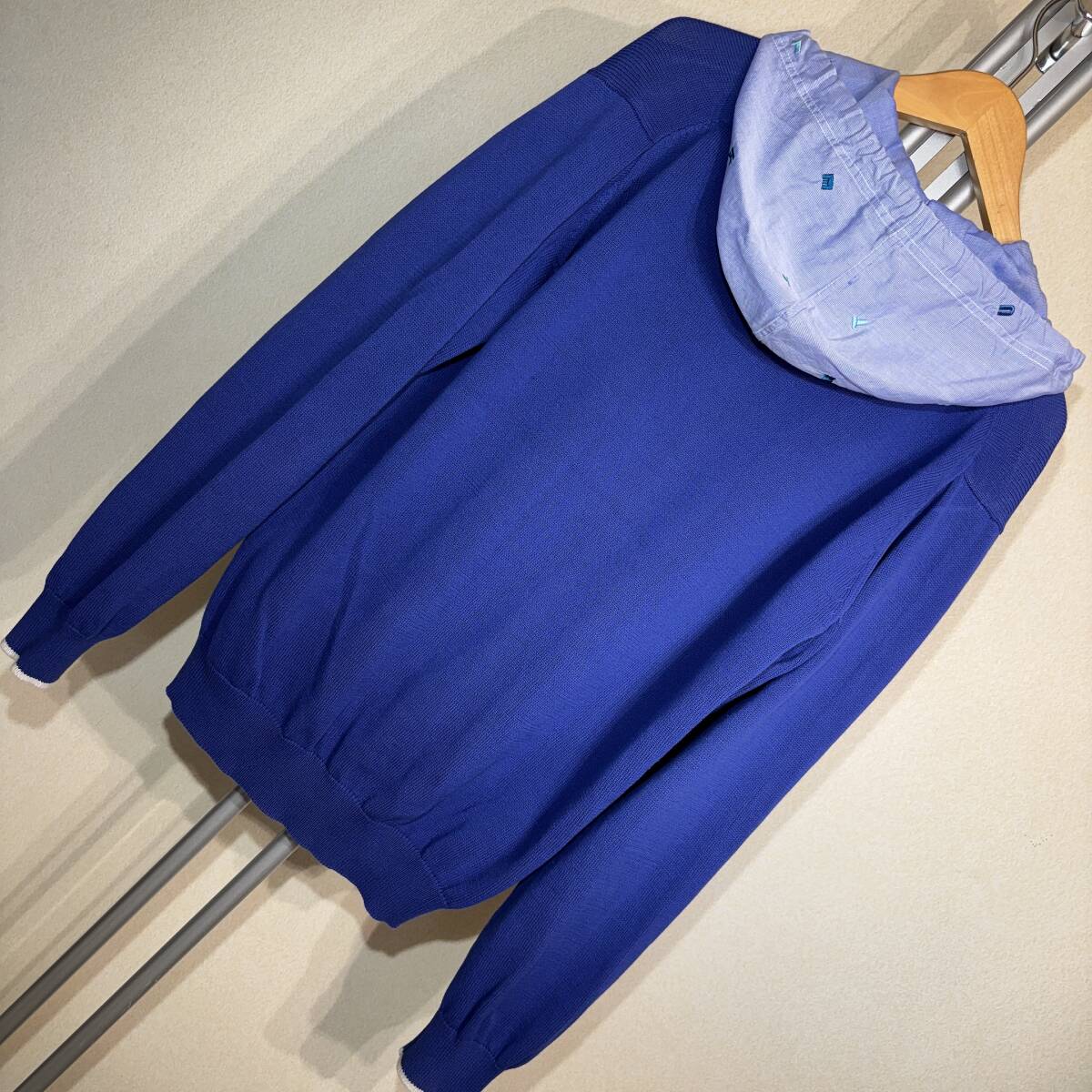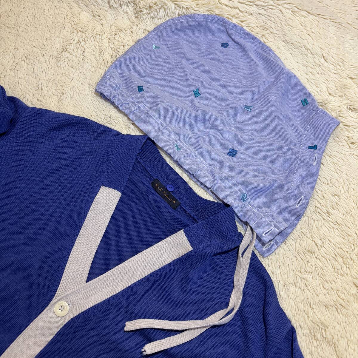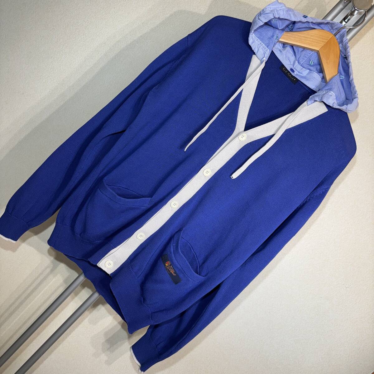 X382美品!■カールヘルム★青紺*アイボリー/ロゴ刺繍入フード★カーディガン■L | ||||||||||||||||||||