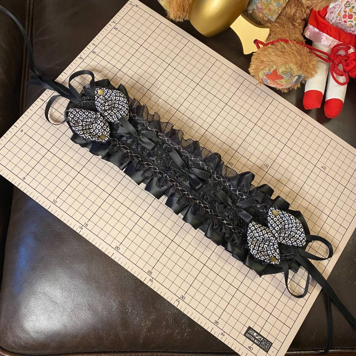 【 着物リメイク ハンドメイド おりぼん ティアラ ヘッドドレス トークハット カチューム カチューシャ ヘアアクセサリー 和洋折衷 レトロ 和ロリータ 上品なブラックを基調とし、繊細なフリルとリボンがクラシカルな雰囲気を演出。 RT-31 】