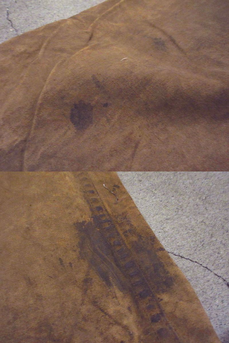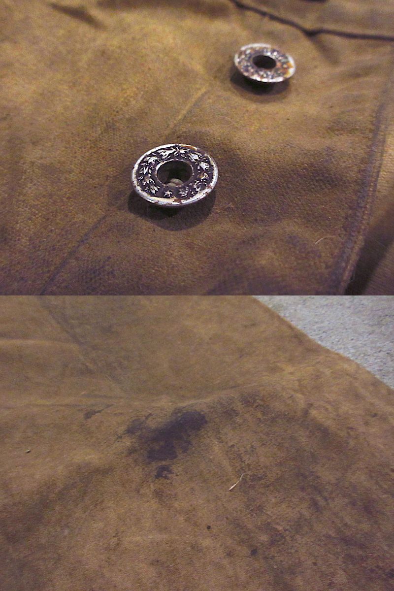 ボタンに錆、オイルの匂い、所々に小穴、ほつれ、全体的にあたり、汚れ