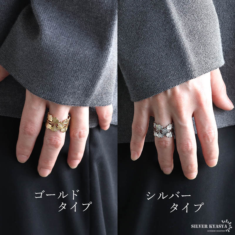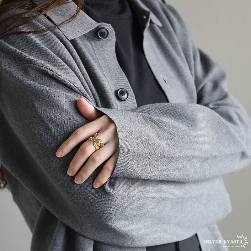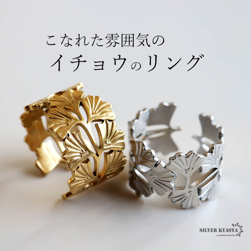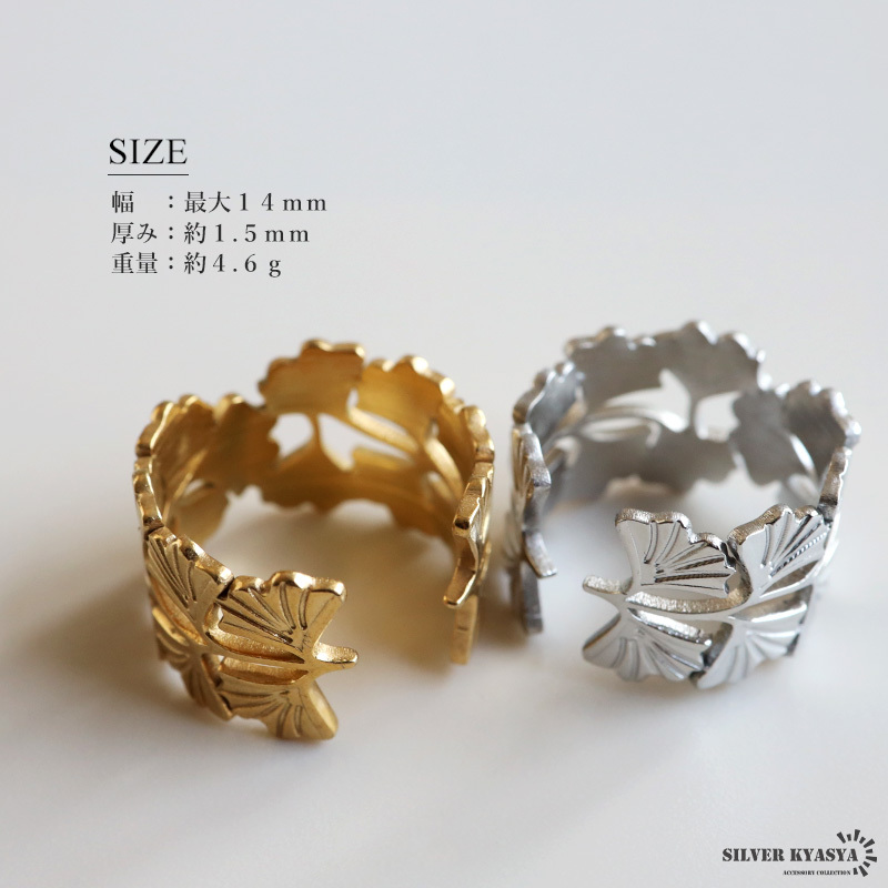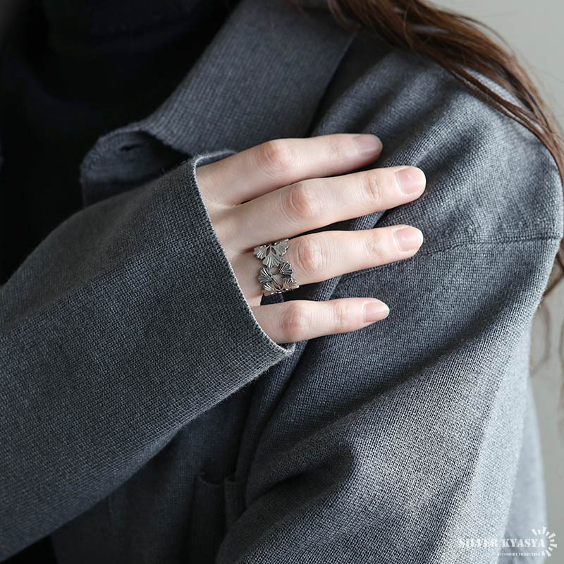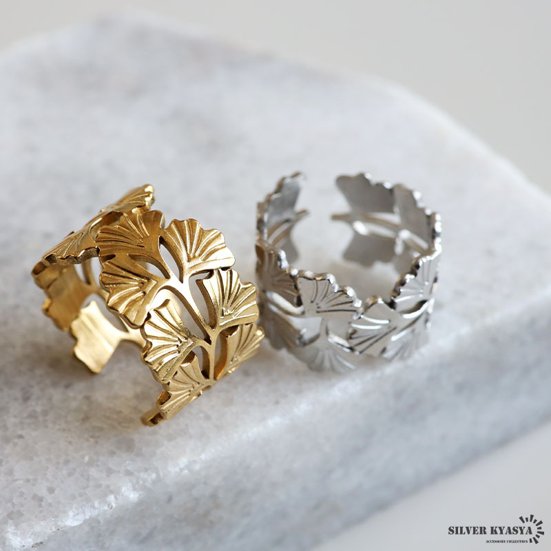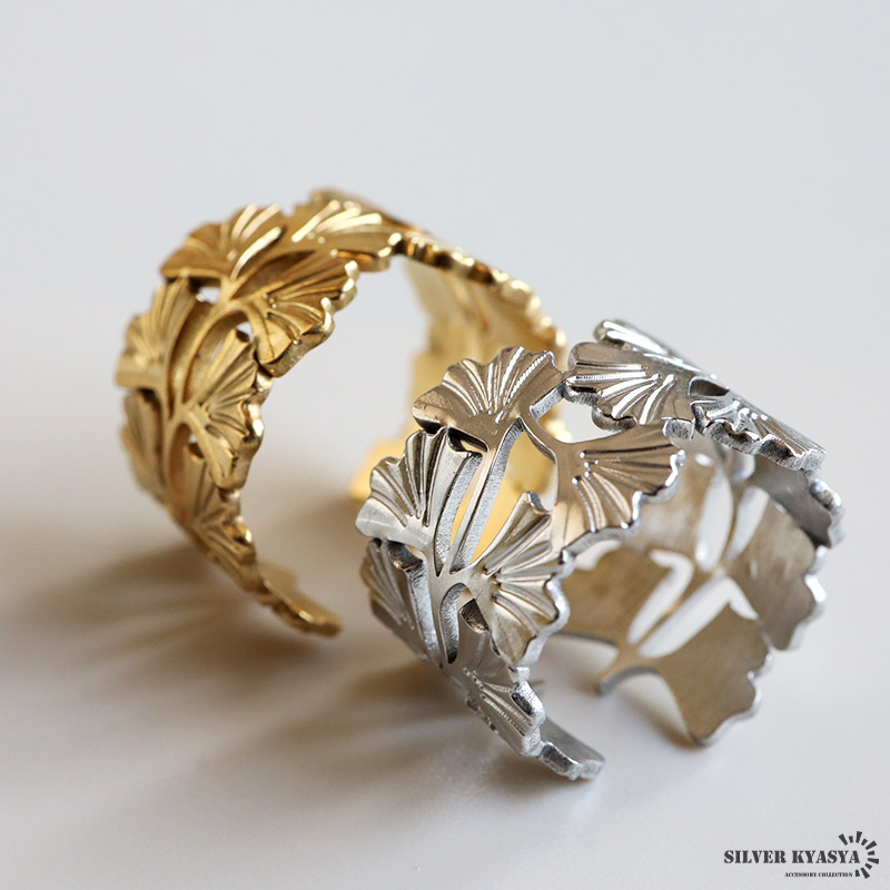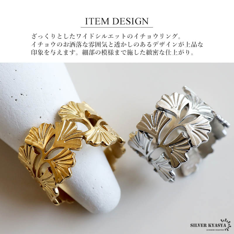 ざっくりとしたワイドシルエットのイチョウリング。イチョウのお洒落な雰囲気と透かしのあるデザインが上品な印象を与えます。細部の模様まで施した緻密な仕上がり。