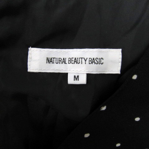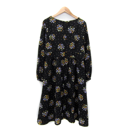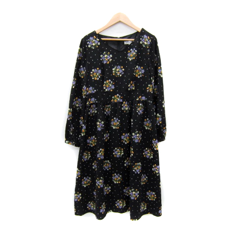 ナチュラルビューティーベーシック ワンピース ミモレ丈 長袖 Vネック 花柄 マルチカラー M 黒 ブラック /SY47 レディース