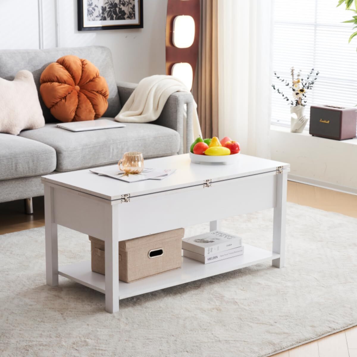 • 【3WAYモード調節と収納可能】 コーヒーテーブルは、3WAYモード調節機能により、天板が前後に分かれて昇降機能とディスプレイシェルフの組み合わせを特徴とします。天板の高さを調節できるガス圧昇降式。女性でもスムーズにお好みの高さに変更できるペダル式で、約45〜60cmの間で無段階調節が可能です。天板を広げて100 × 100cmの大きなスペースにすることができ、3 ~ 4人で利用可能です。コンパクトで使いやすいサイズ感のテーブル。2人暮らしや、小さいお子様がいるご家庭にもオススメです