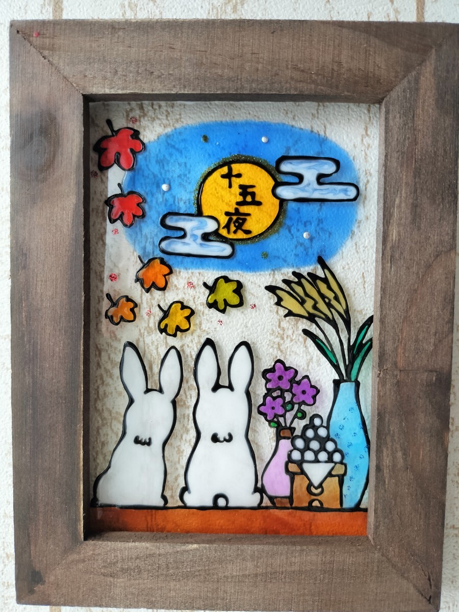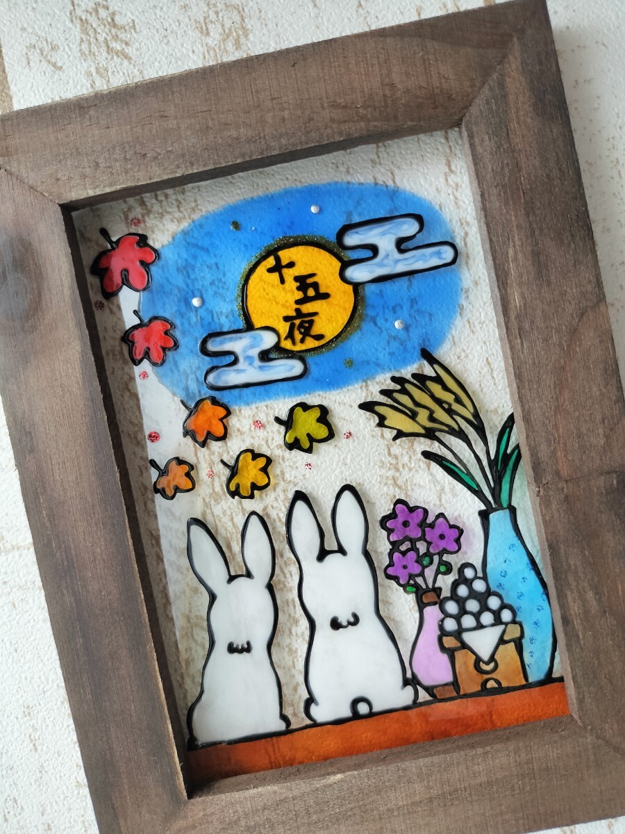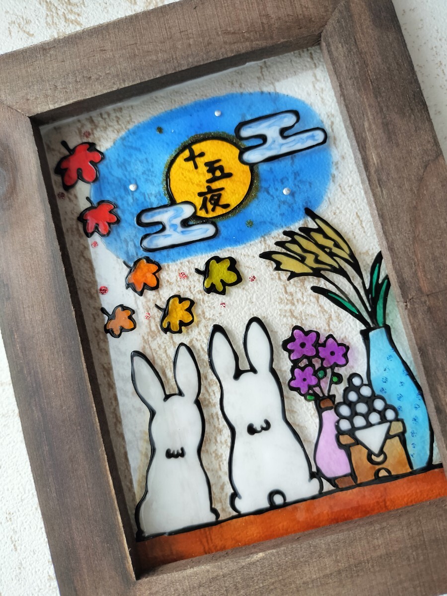 光が当たると、色合いやデザインが優しく反射し、見るたびに新たな楽しみをお届けします。サイズは縦約12cm・横約16cm程度で、ガラス絵の具を使用した薄いアクリルに、秋の美しいうさぎのお月見が描かれています^^
