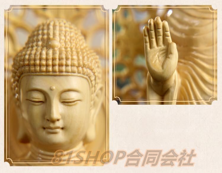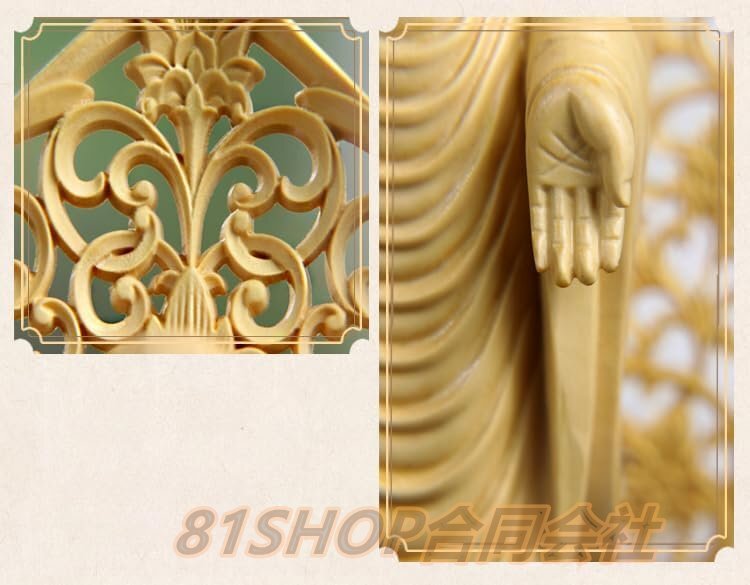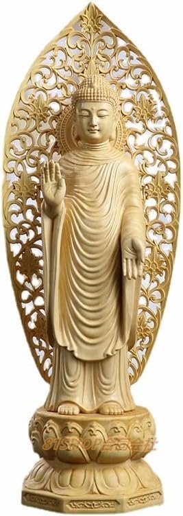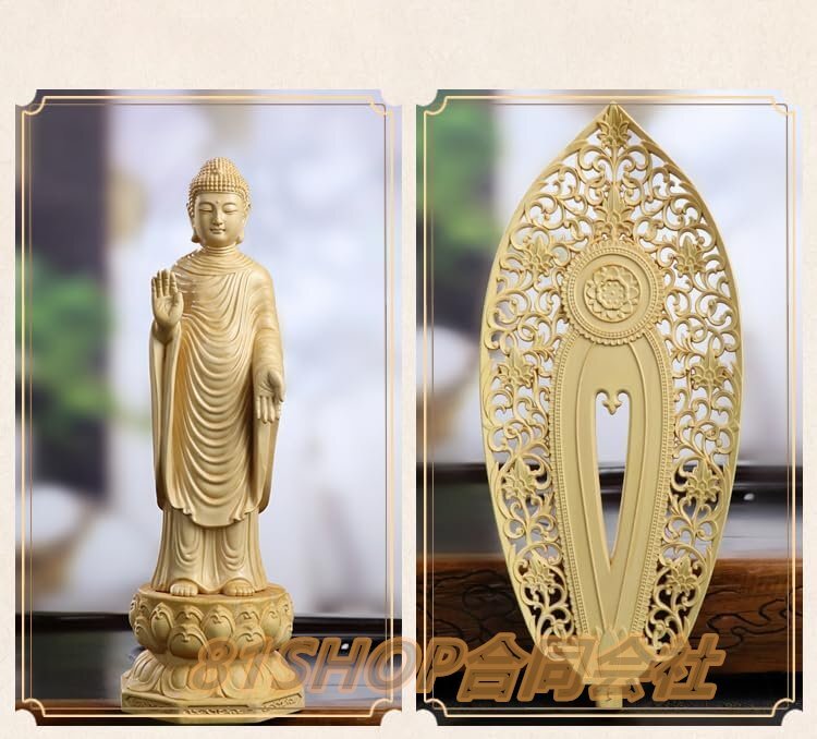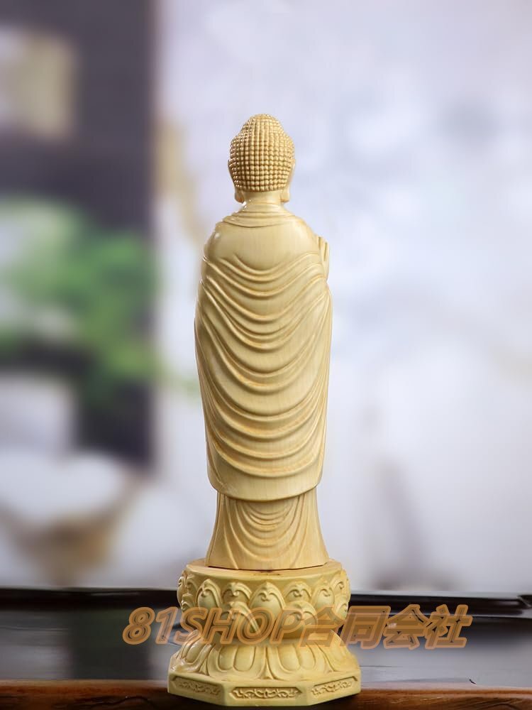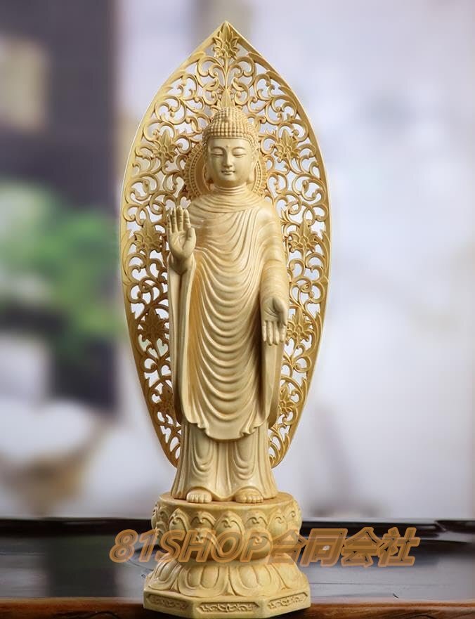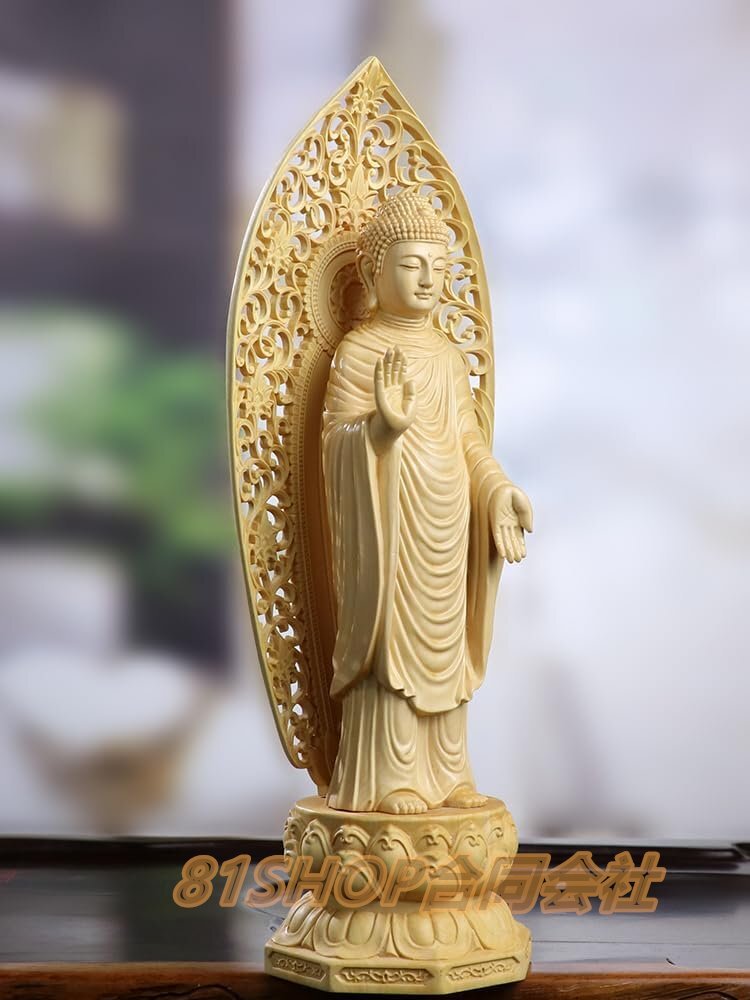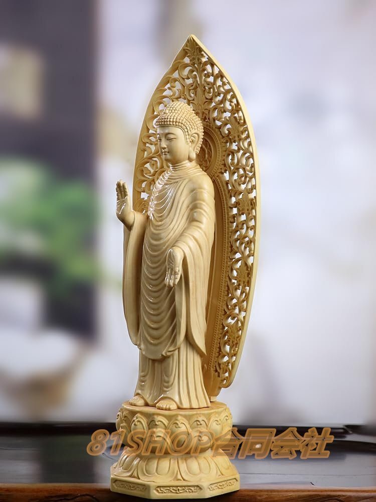 木彫り 置物 仏壇仏像 仏像 釈迦如来 立像 仏像 如来像 蓮華座 唐草光背 柘植の木 祈る 厄除け(高さ23cm)