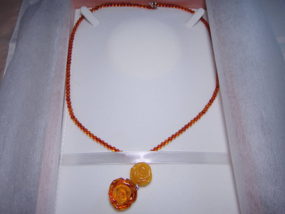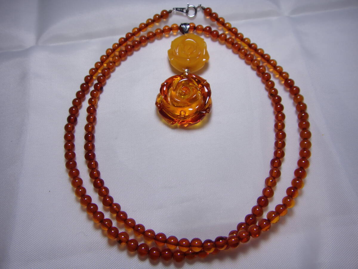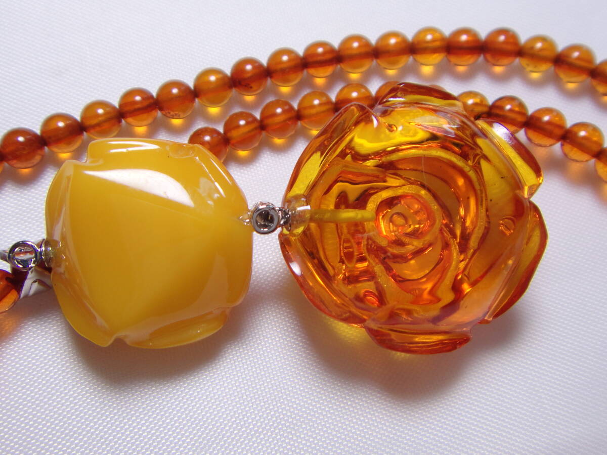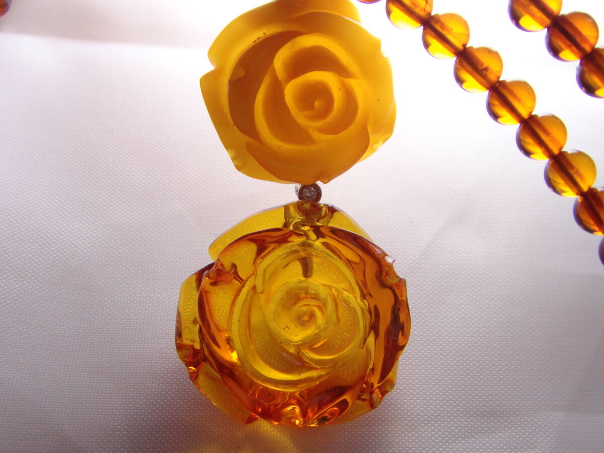 本琥珀 ロイヤルアンバーの薔薇彫りネックレスです。