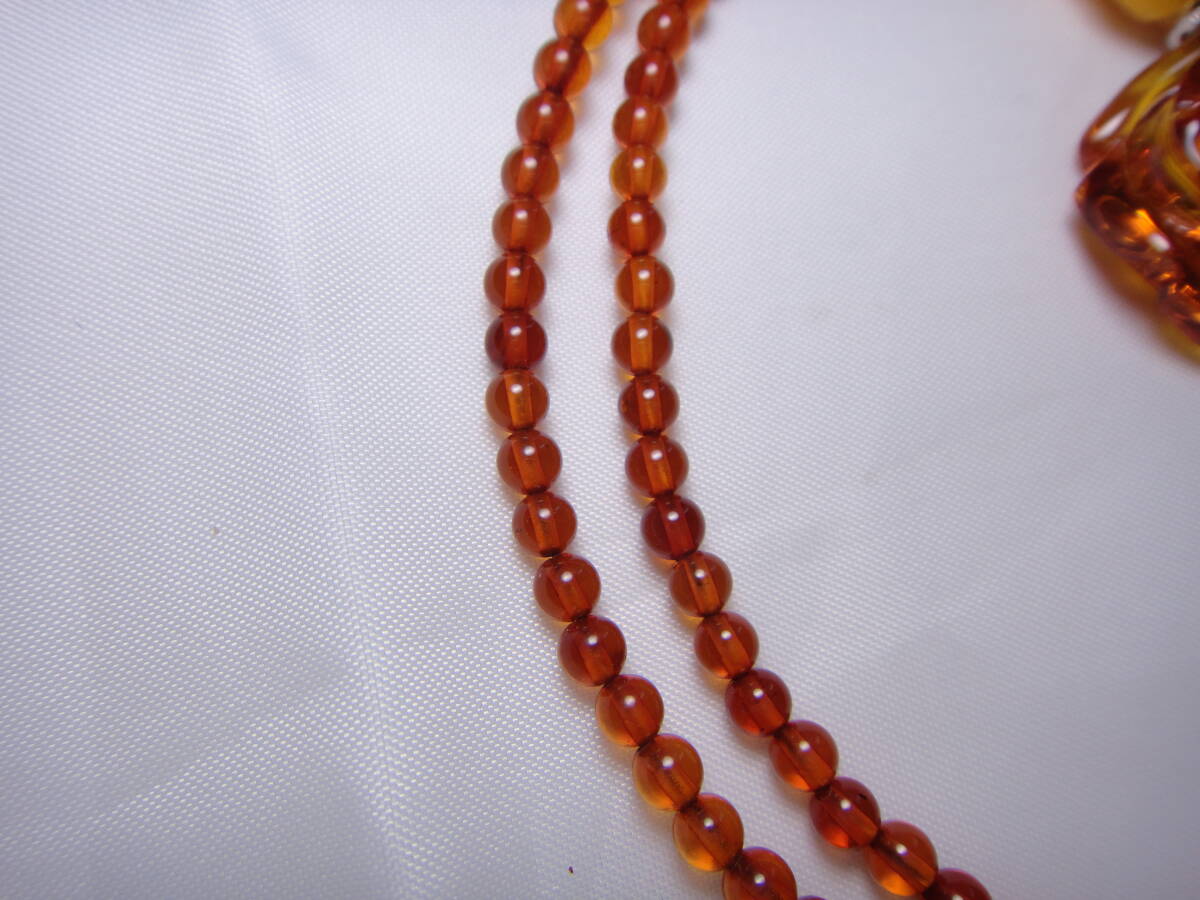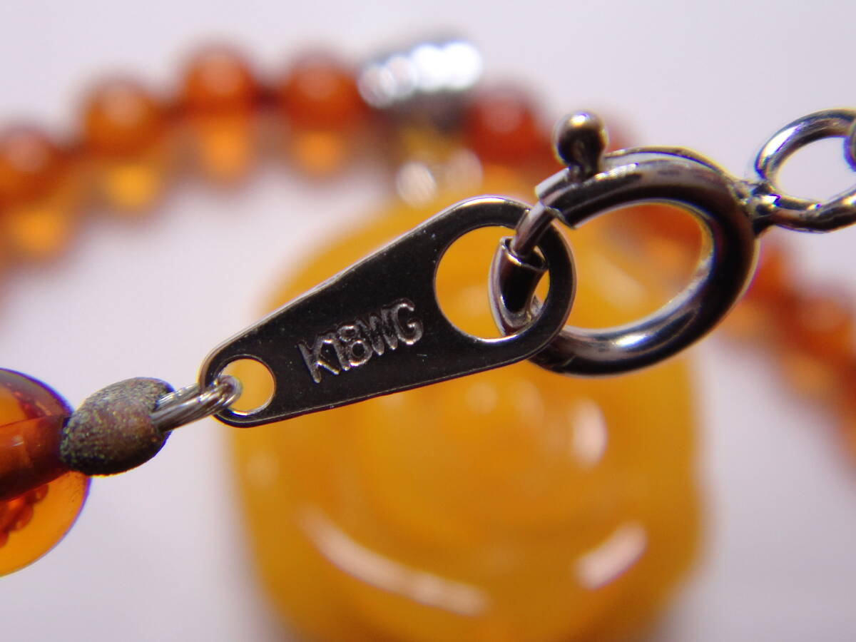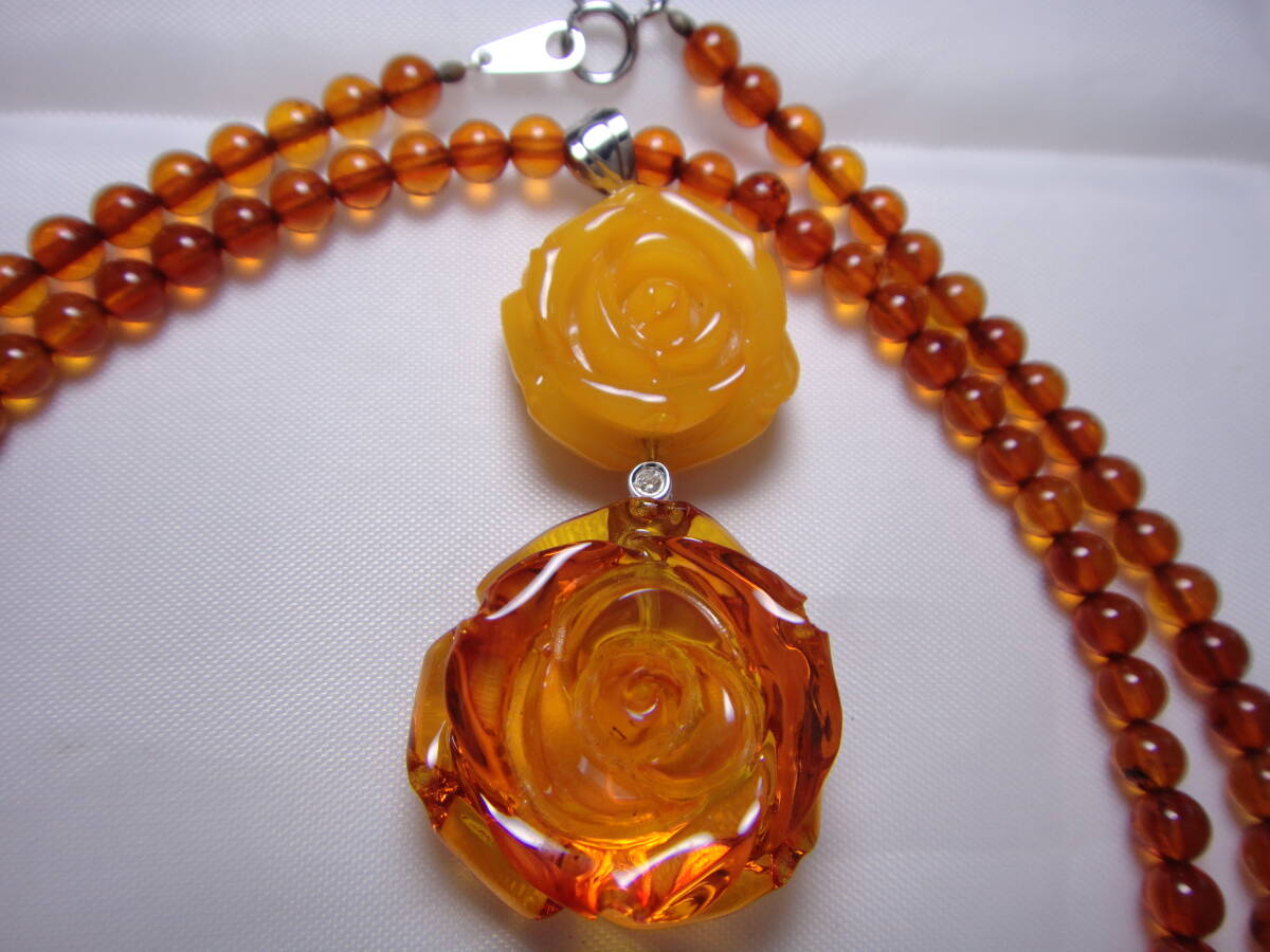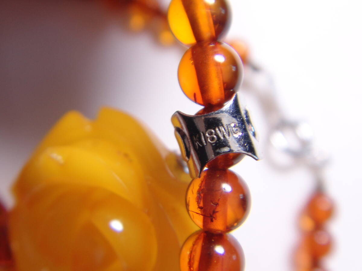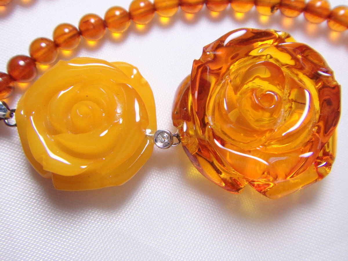 本琥珀 ロイヤルアンバー 本コハク ダイヤ付き 高品質! ネックレス 薔薇彫り K18WG刻印 ケース付き 約50㎝ ヴィンテージ
