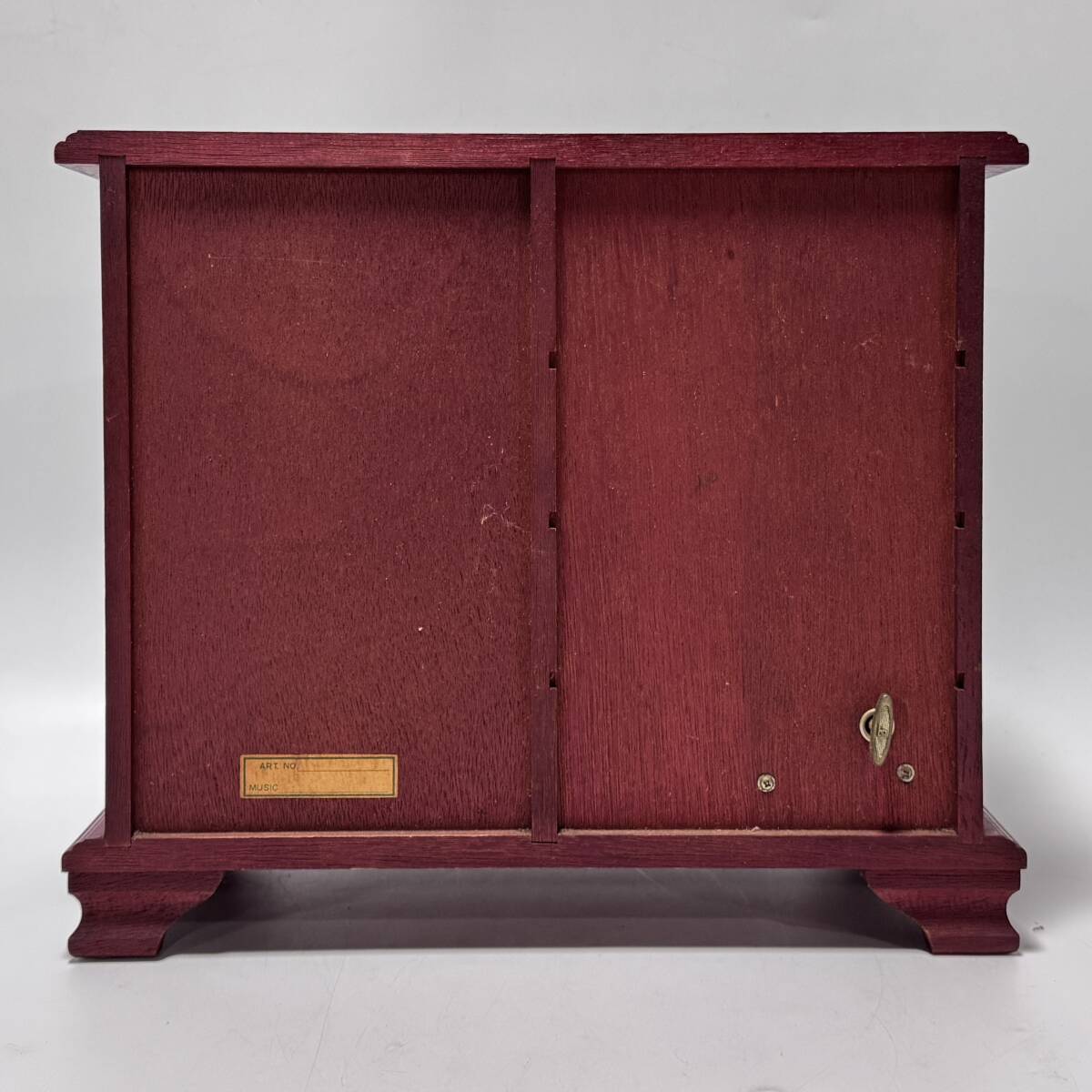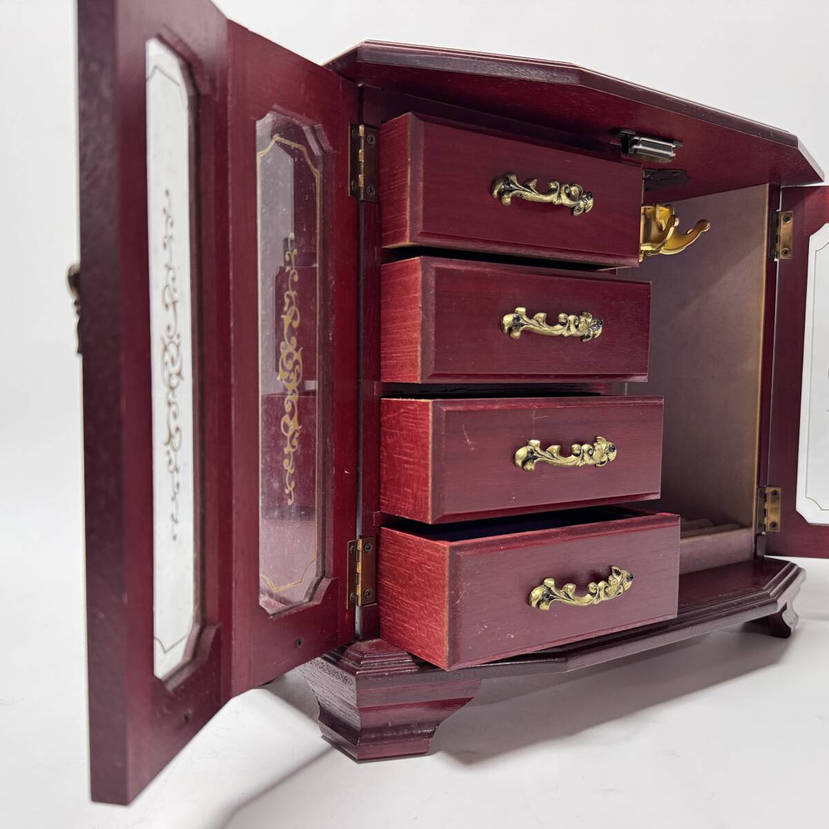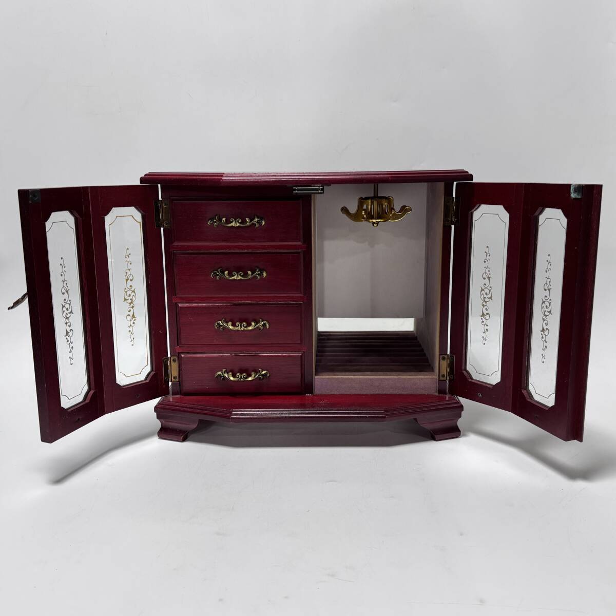 木製 オルゴール付き ジュエリーボックス 観音開き 引出し4杯 リング指 回転式ネックレス掛 幅33.5×奥行17×高さ29㎝ 経年保管品 現状品の出品です。