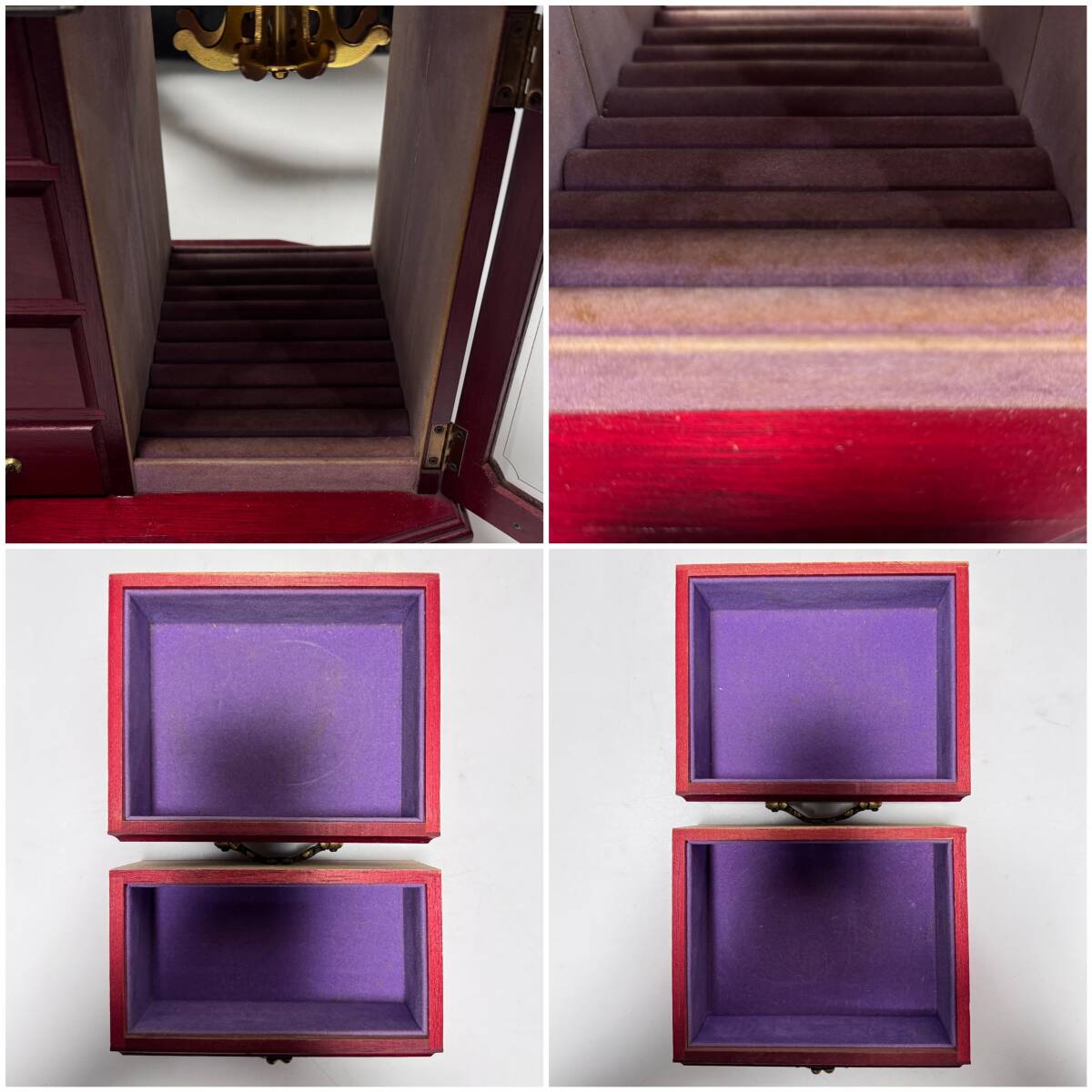 状態は外観は特筆するダメージ(汚れや目立つスレキズ、あたりキズなど)は見られませんが、内部の引出し、リング差しに使用、経年に伴う汚れ、色褪せなどが見られます。