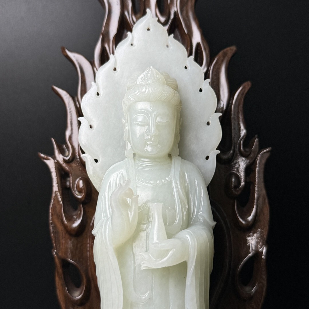 【瓏】和田玉 白玉彫 大慈大悲 福灑人間 浄瓶観音擺件 時代物 極細工 手彫り 置物擺件 中国古賞物 古美術 蔵出