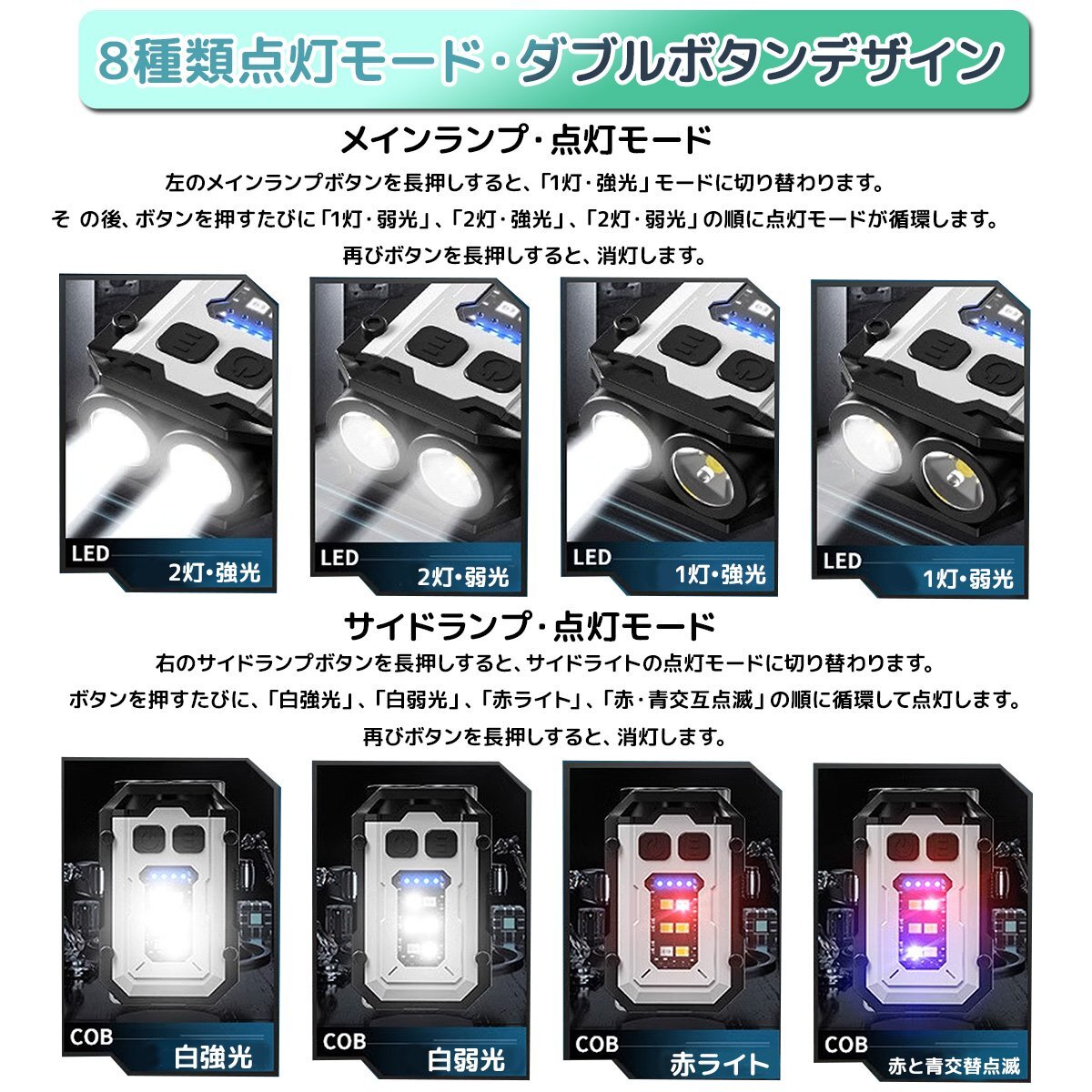 ●多機能8種類点灯モード:通常の明かりから非常時のフラッシュまで、用途に応じて切り替え可能です。
