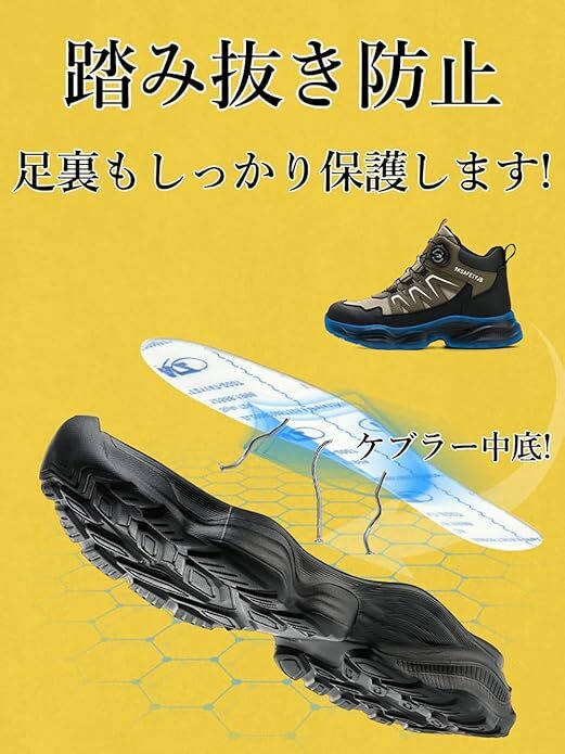 【安全性能】あんぜん靴のつま先部分には高強度と軽量を兼ねる鋼製先芯入れ、危険をはらんでいる作業場に刃物や重量物の衝撃から足を保護します。1100Nの穿刺力に耐えるケブラーミッドソールを採用し、足を怪我から守ります。