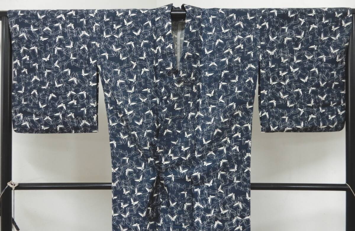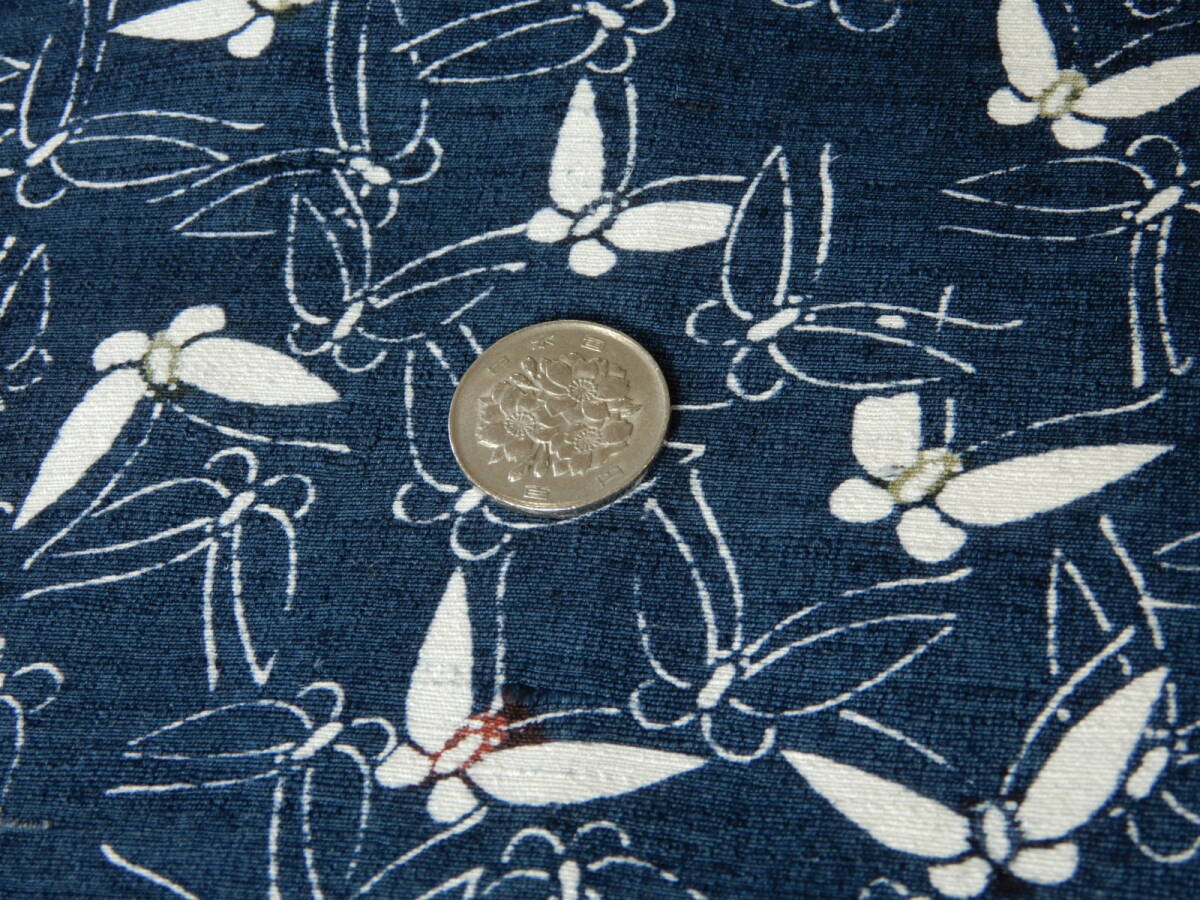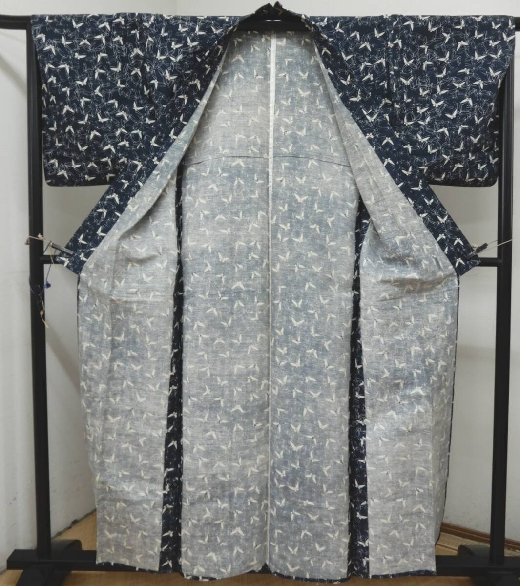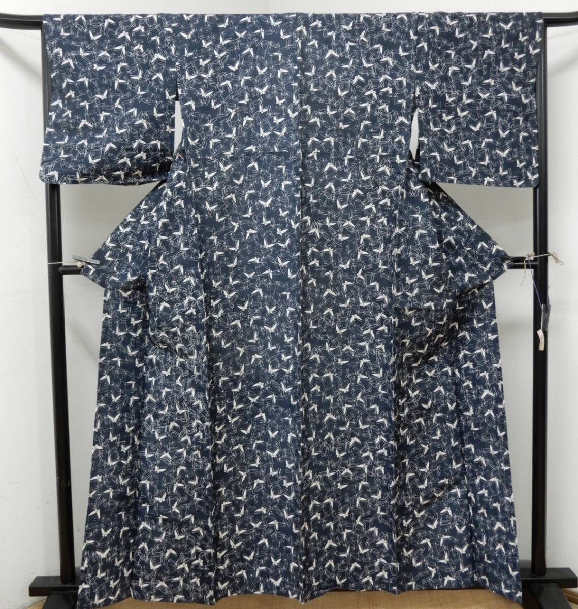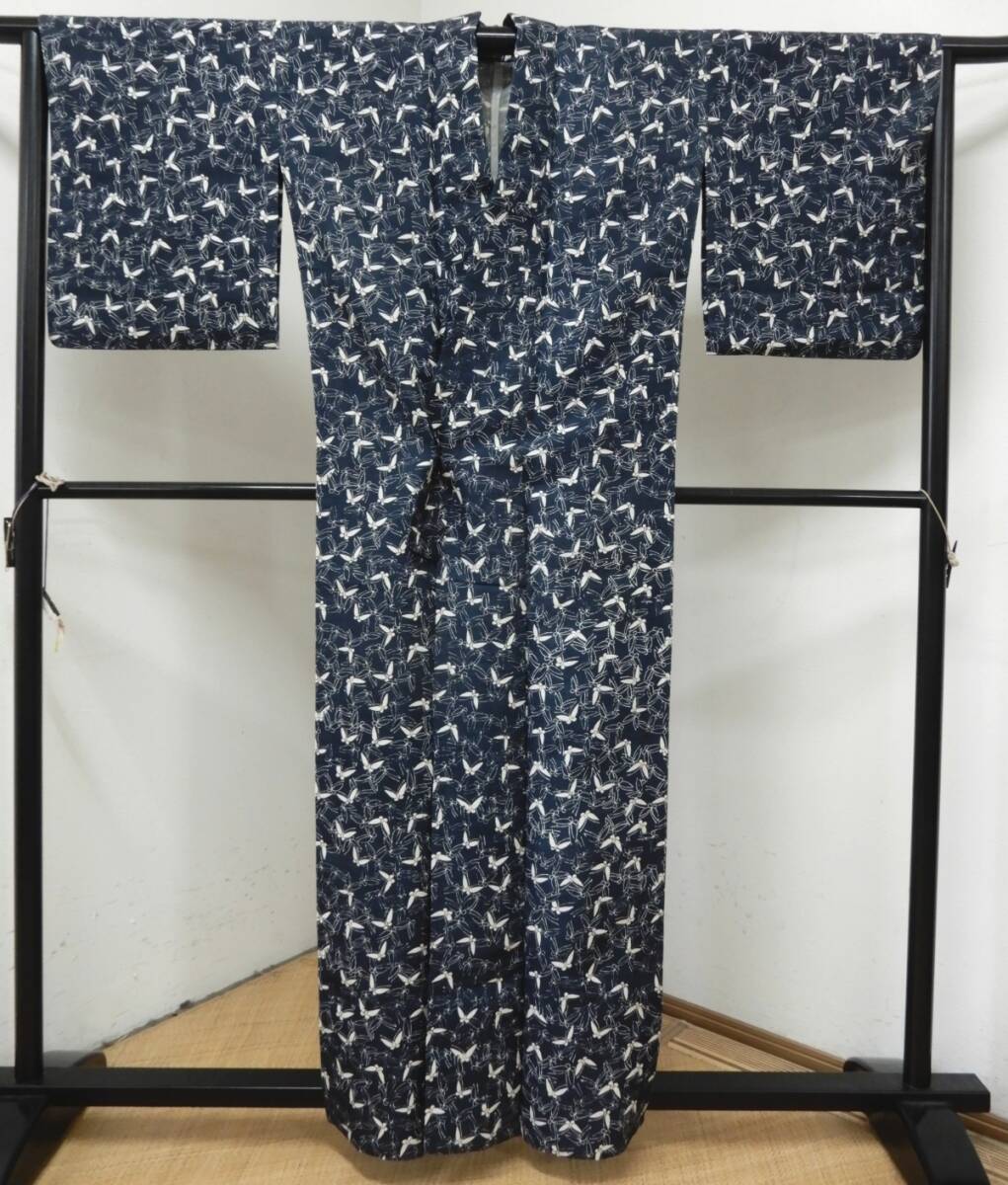<銀の斧>正絹・紬地型染め小紋単衣着物・蝶・顔料