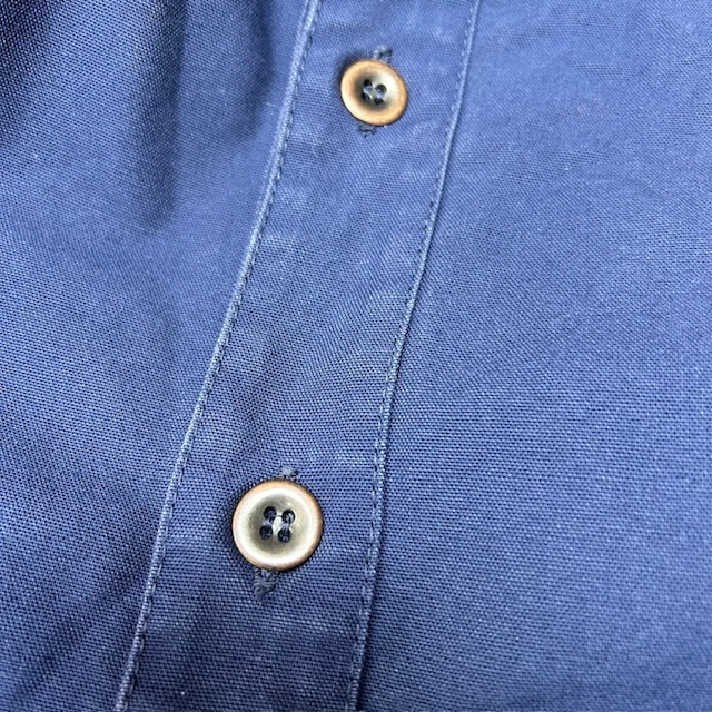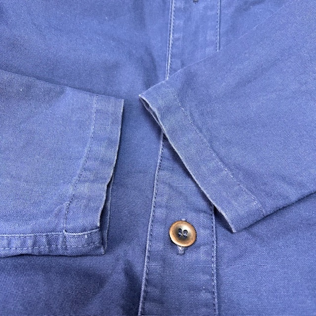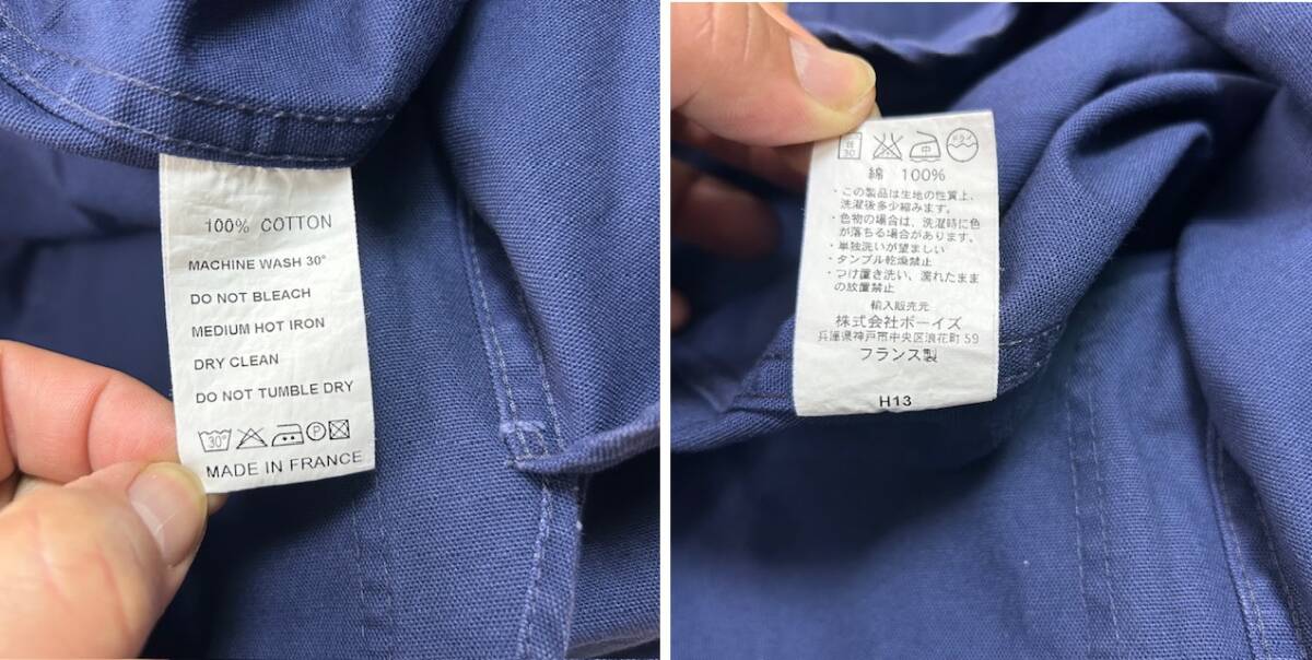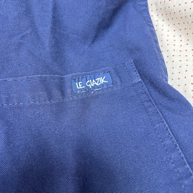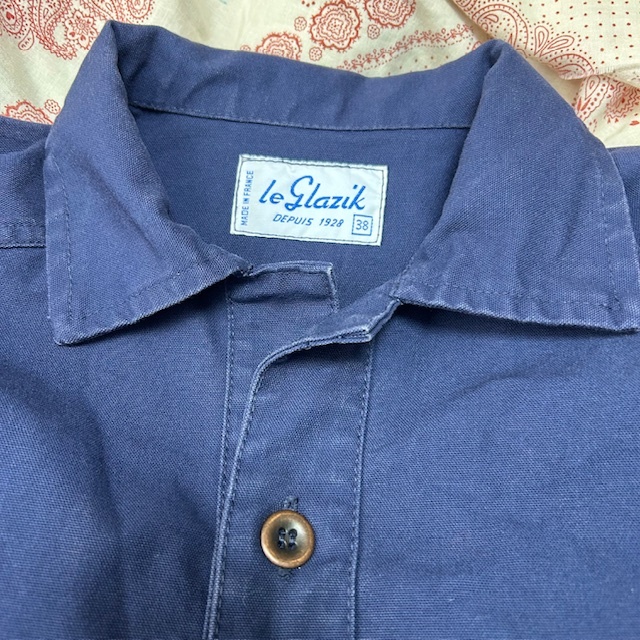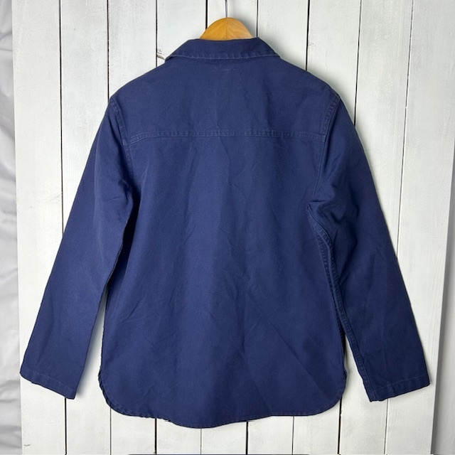 ●商品説明・・・フランスのワークウェアブランドのル・グラジックのしっかりしたコットンキャンバス生地(目の細かなダック生地)のカバーオール(ワークジャケット)です。裾サイドがシャツのように切れ込み(ラウンド)の入ったデザインになっています。一枚生地の春秋向けのライトアウターで、冬はアウターの中に着ていただける感じの一着です。made in France (フランス製)で、素材はコットンで、色は紺(ネイビー)です。サイズ表記は38で、S~小さめM程度のサイズ感かと思います。