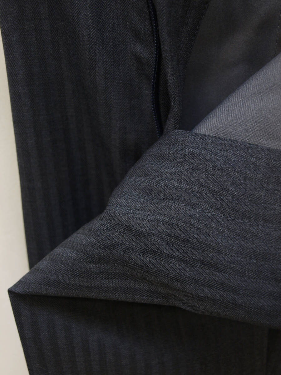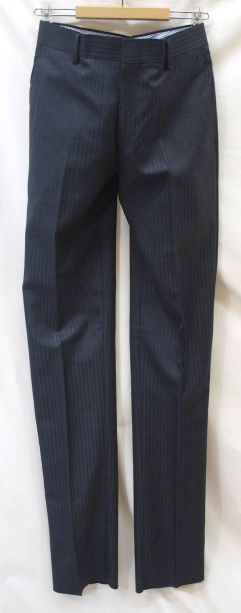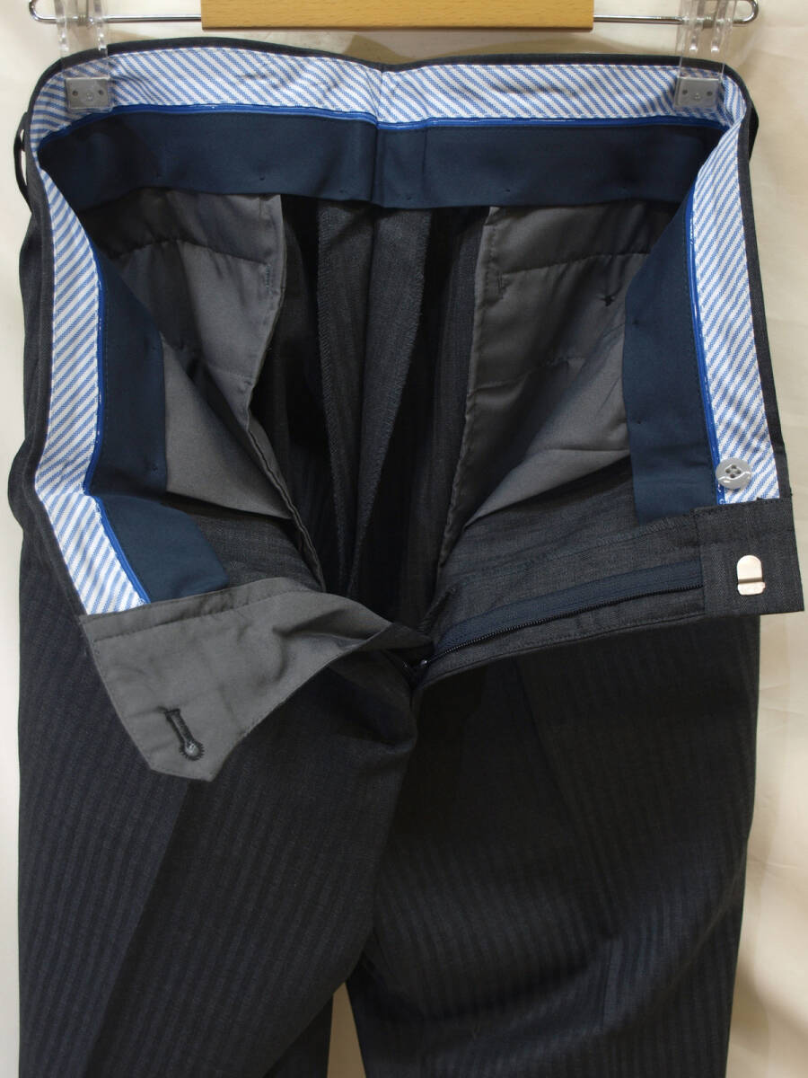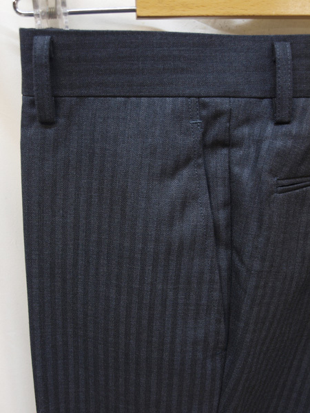 =デザイン= 極端に細身ではなく、かといってだぼつき感のないスタイリッシュノータックパンツ 着た感じはすっきりとしたシルエットで大人のビジネススタイルにおすすめです。 裾上げ未処理・新品・未使用 =サイズ= 表記サイズ ウエスト85cm =実寸= 胴回り実寸 86cm わたり幅(股下0cm部分) 32cm 股下から10cm下部分 29cm 裾幅 18.3cm 股上 23.5cm 前股上 26cm 股下 92cm =素材= ポリエステル70% ウール30% 秋冬向けのビジネススーツに使用するウールブレンド生地を使用 スーツ生地なのでどちらかというと薄手なので真夏を除くほぼオールシーズンご着用可能です。 =色柄= ヘリンボーンストライプ織柄がはいった濃いめのグレー =仕様= ノータック/膝裏なし/フロントはファスナーでホック仕様/うちかけボタンあり/脇、斜め付けポケット/後ろポケット、両玉仕上げで左のみボタン付き/シャツ滑り止め付き きちんとしたビジネススラックスの縫製仕様となります。 |