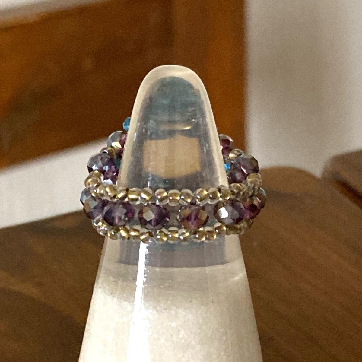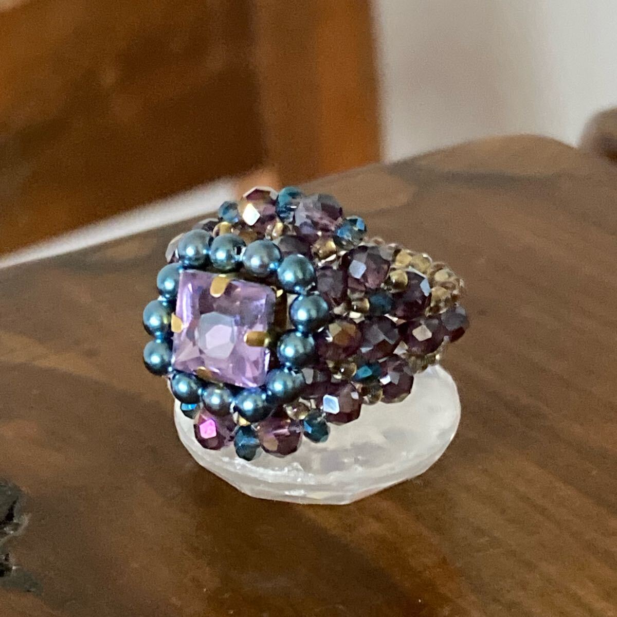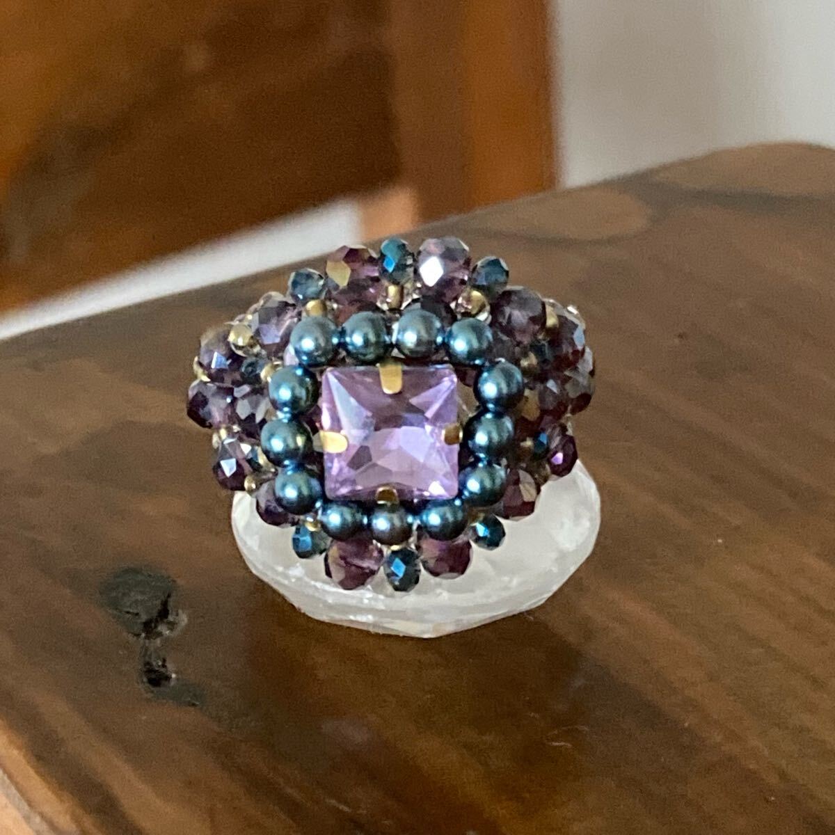 8mmの薄いパープルのスクエアガラスラインストーン、4mmのパープルのボタンカットビーズ、ブルーのミニボタンカットビーズ、3mmのブルー系のパールビーズ、クリアゴールドの丸小ビーズで作ったリングです。