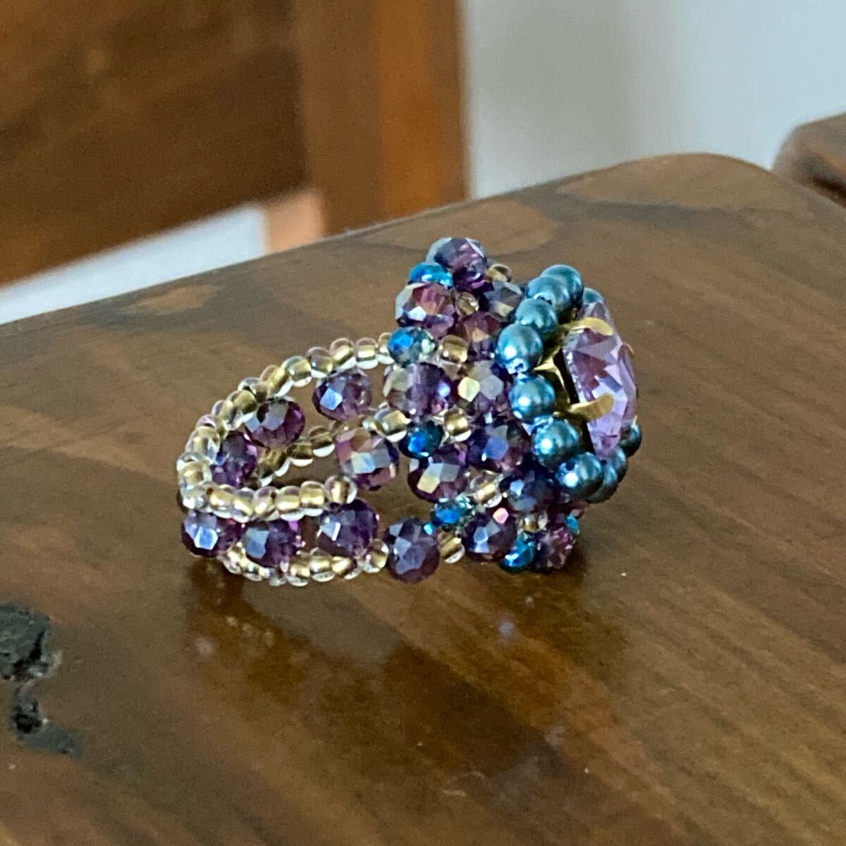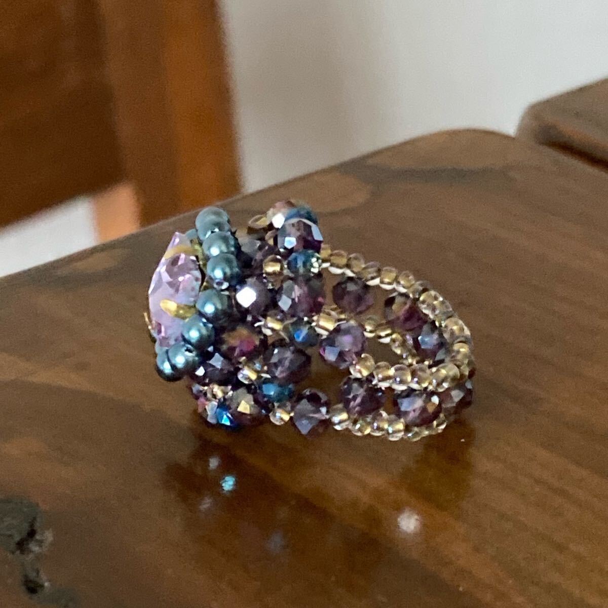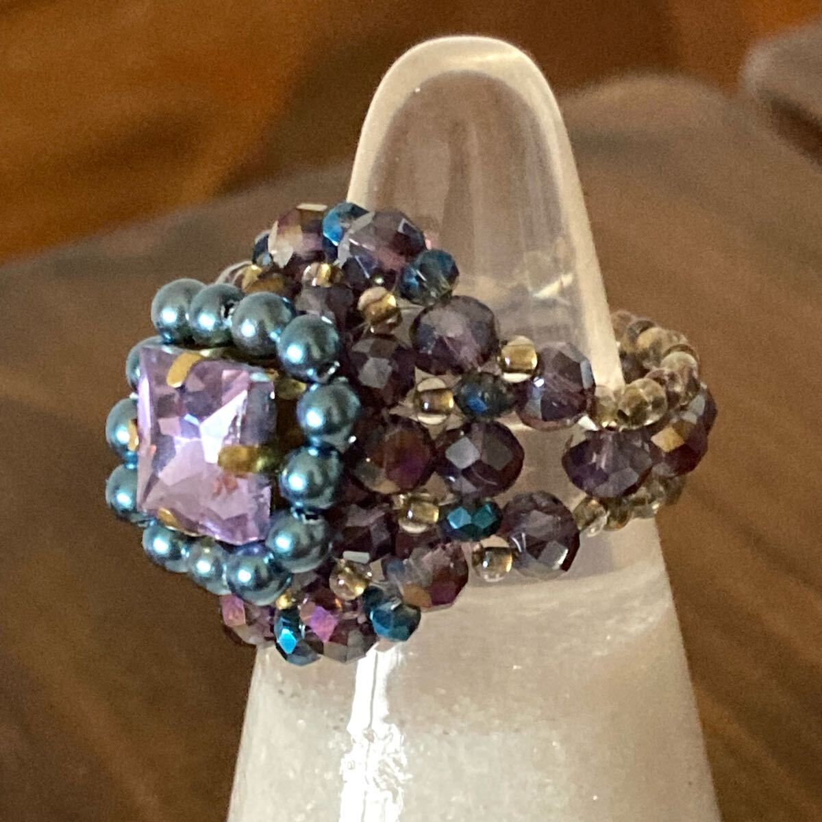 8mmの薄いパープルのスクエアガラスラインストーン、4mmのパープルのボタンカットビーズ、ブルーのミニボタンカットビーズ、3mmのブルー系のパールビーズ、クリアゴールドの丸小ビーズで作ったリングです。