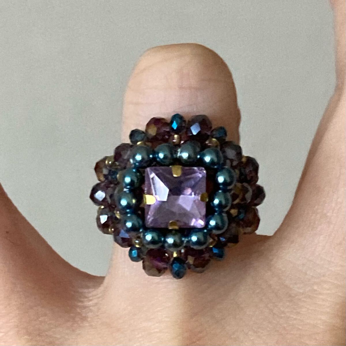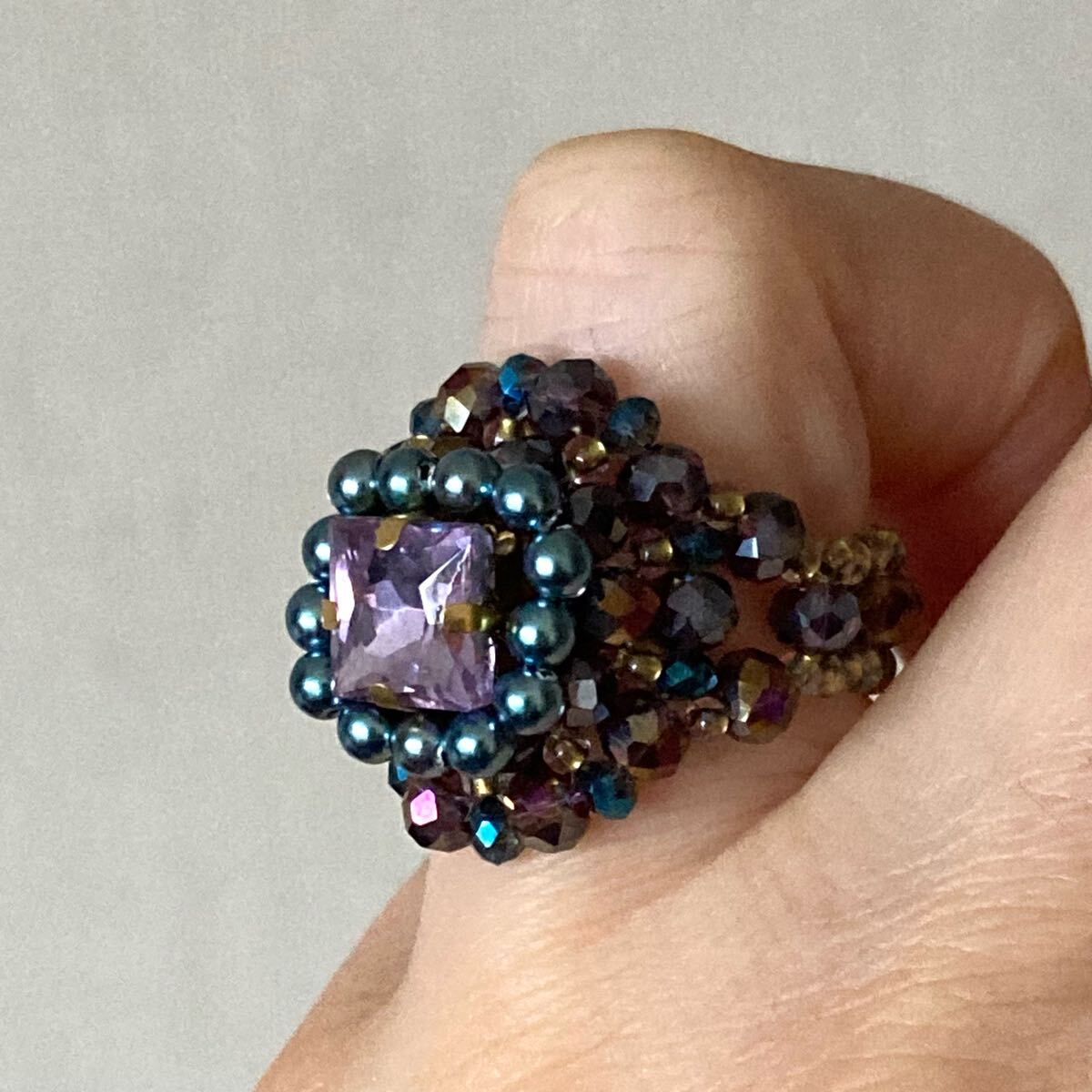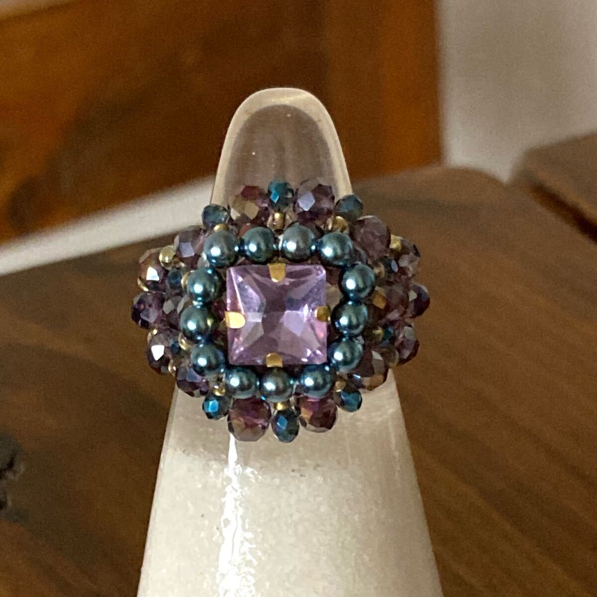 スクエアラインストーンの周りをパールビーズとボタンカットビーズ等で3重に細かく編んだデザインのリングです♪