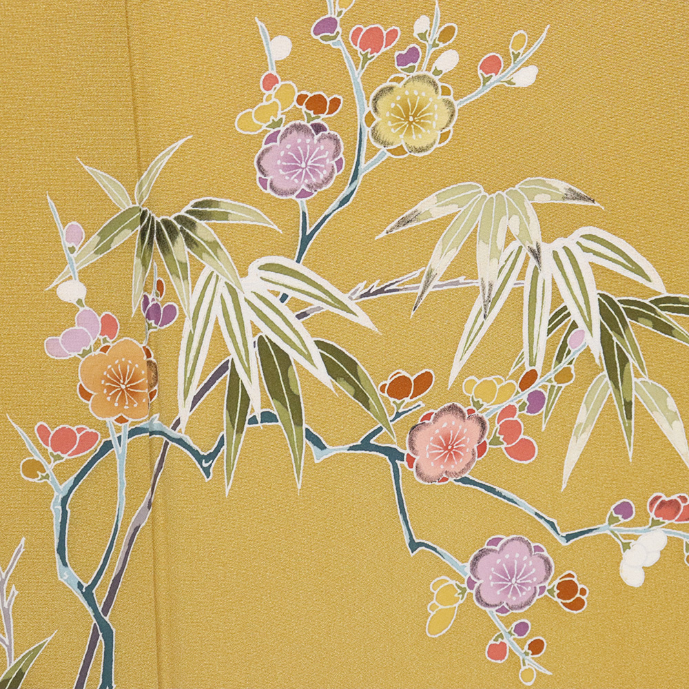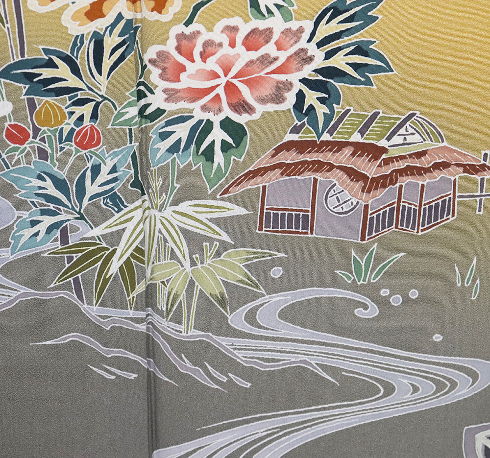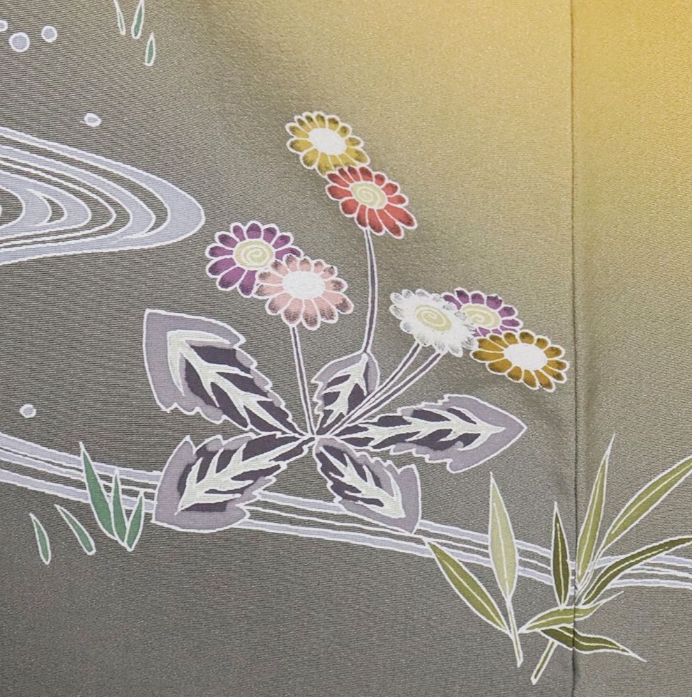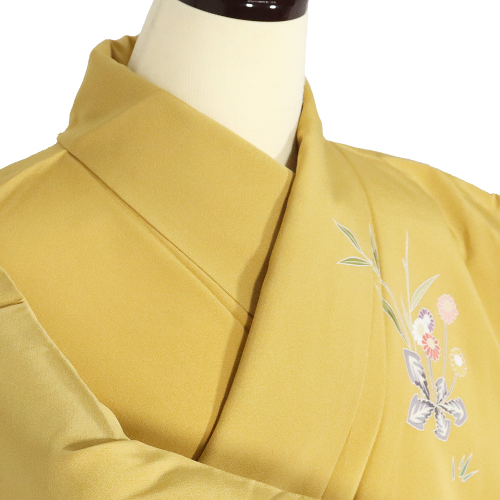 | 色・柄 | 訪問着 袷 丹後縮緬地 黄土色(黄朽葉色)・グレー紫(濃色)暈し地 茶屋辻・草花 梅・笹・牡丹・タンポポ (写真では上手く色が出ない場合があります。ご了承下さい) |