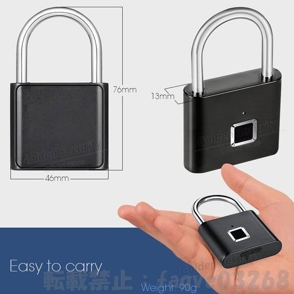 ☆商品説明 | *幅広い用途:ドア、キャビネット、自転車、バックパック、収納ロッカーなどに最適です。 *簡単な操作:ツールは不要です。ユーザーマニュアルの指示に従って指紋を簡単に追加または削除できます。 * 10個の指紋グループ:南京錠は最大10個の指紋記録をサポートします(2人の管理者をサポート)。 仕様: 1.素材:亜鉛合金 2.動作電圧:3.0-4.2V 3. 3.ロック重量とサイズ:90g、7.6 * 4.6 * 1.3(cm)4. 4.指紋センサーの適用範囲:72 * 64MM 5. ロック解除速度:1秒以内 6.動作期間:1年電力あたり 7.LEDライト:3色のライト:赤/青/緑 8.Battery:3.7Vリチウム電池に内蔵 9.Working温度:-10~+ 40℃摂氏 10.指紋容量:10回記録して10を節約グループ パッケージ: 1 *指紋ロック 1 * USB充電ケーブル 1 *ユーザーマニュアル ■バリエーション選択■ 【カラー】 ブラック/シルバー 一部直訳の為、分かりにくい部分がございましたら、ご質問お願いします。 カラー、サイズなどが複数記載の場合は選択可能です。 ご落札後にご選択ください。 |