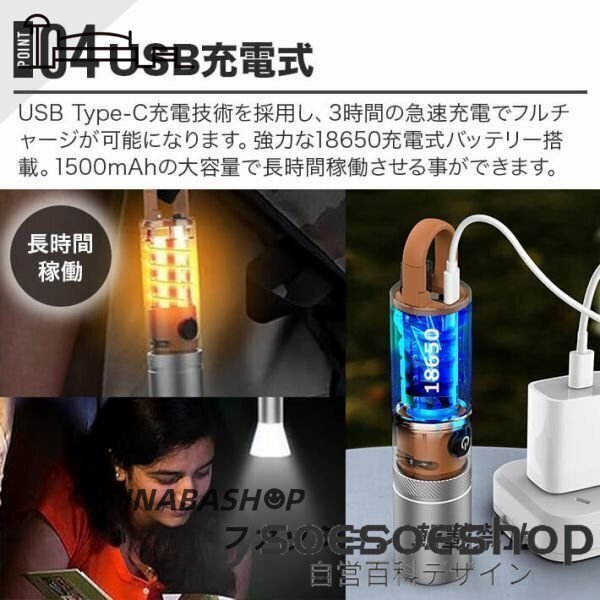 最新のUSB Type-C充電技術を採用した充電式の懐中電灯兼ランタンです。これにより、充電がより便利かつ効率的に行え、3時間の急速充電でフルチャージが可能になります。