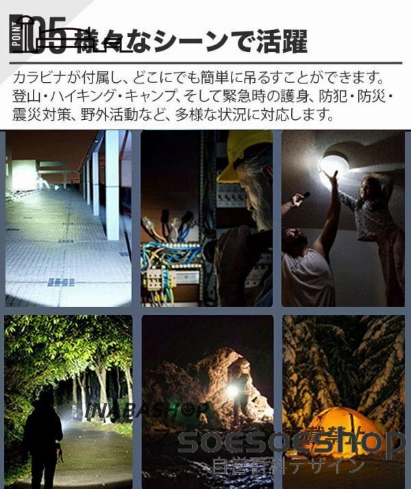 LEDハンディライトとキャンプライトが完璧に融合し、さまざまなシーンで活躍することができます。登山・ハイキング・キャンプ・サイクリングや作業、そして緊急時の護身、防犯・防災・震災対策、野外活動など、多様な状況に対応します。この懐中電灯プラスランタンは、多機能性を備えながらもコンパクトで軽量(全重量115グラム)な設計になっており、持ち運びに負担がかかりません。リュックやポケットに入れることができ、また装備に取り付けるのも簡単です。この製品があれば、異なるシーンに合わせた複数の照明製品を購入する必要がなくなります。