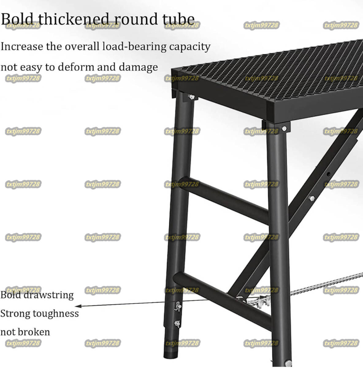 【S安全ロック】:作業台は安全ロックを備えて特別に設計されており、安全性と安定性を確保します。プラットフォームを広げるとしっかりと連動し、安全に使用できます。底部には、強化されたクロスメンバーと固定ストラップもあり、より安定した構造を保証します。