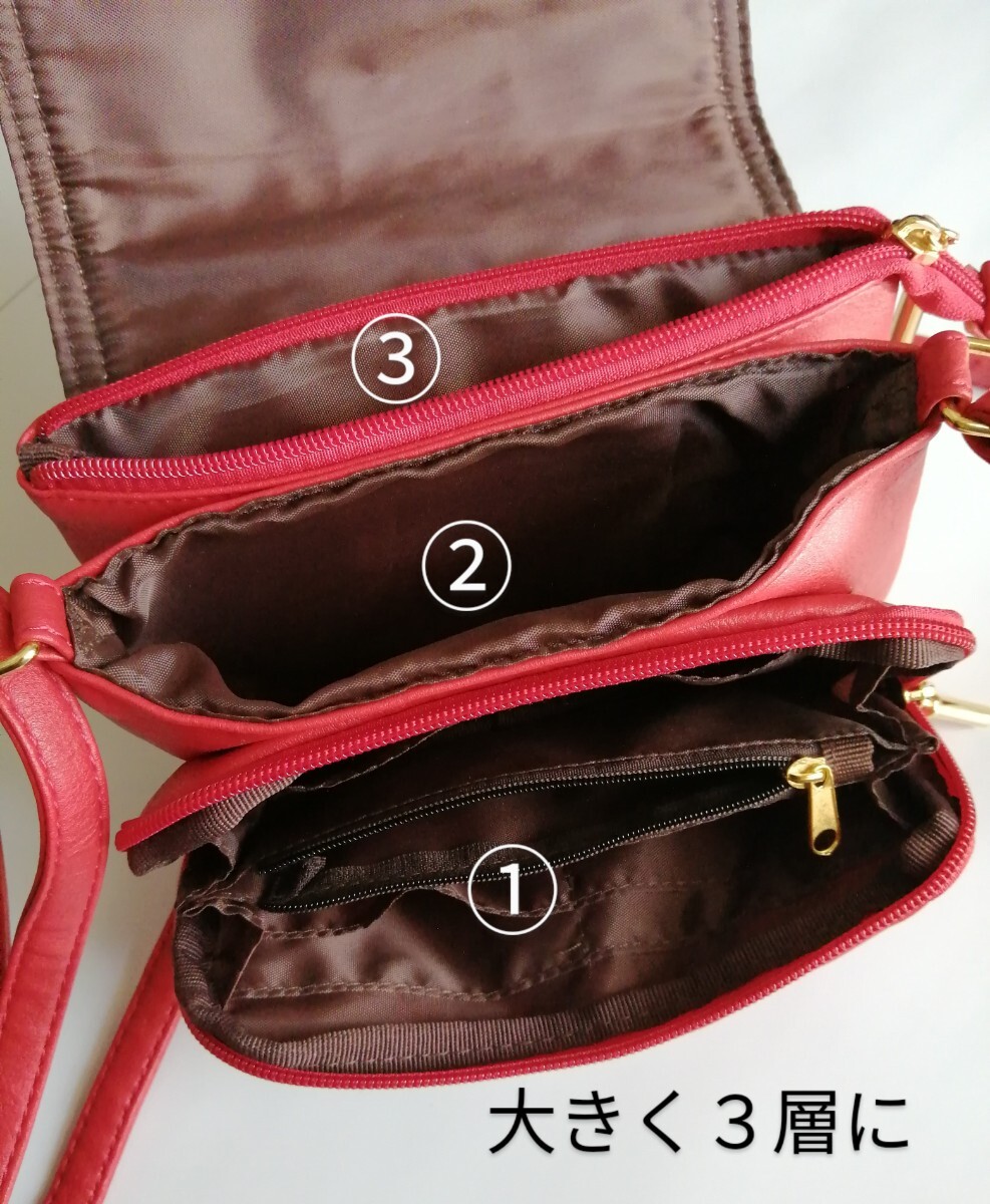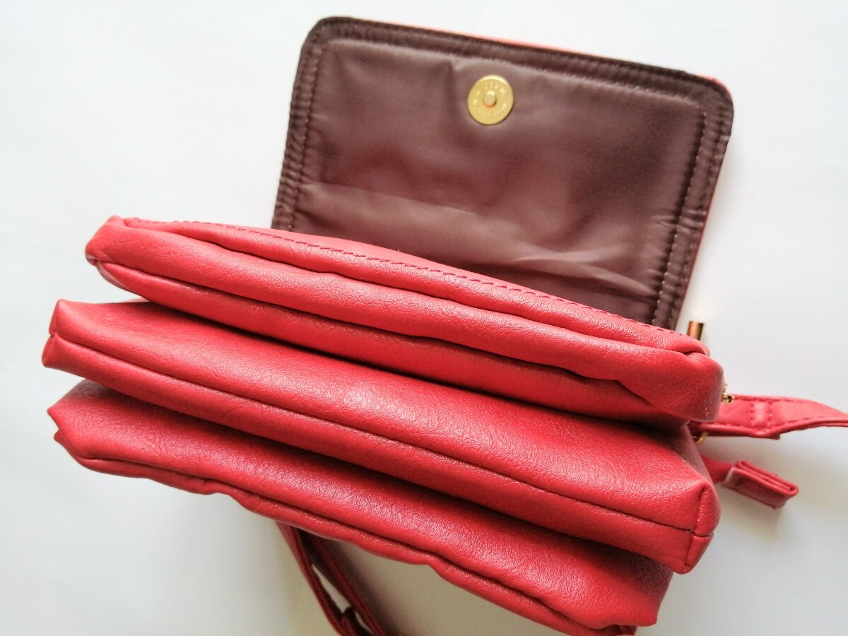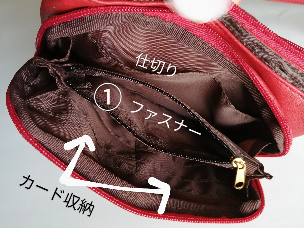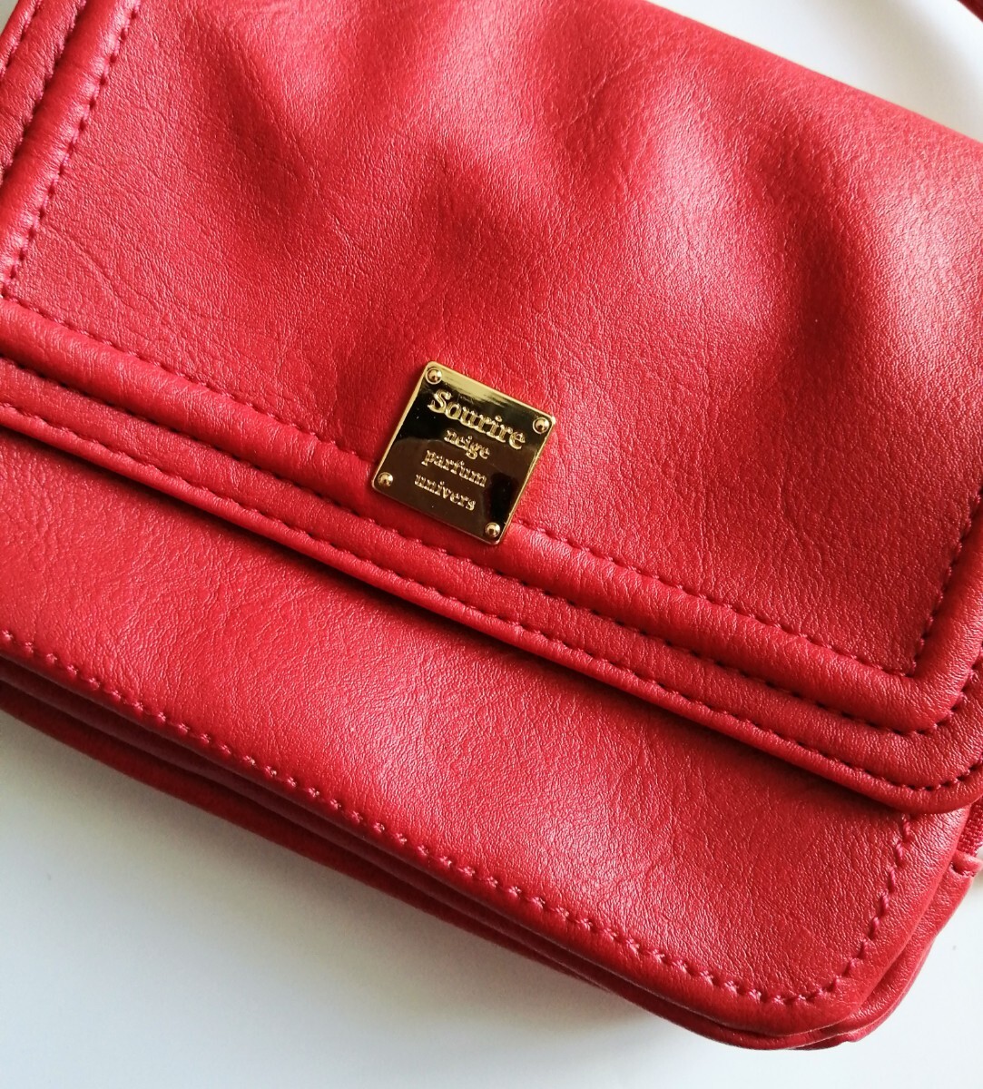 美品「Sourire 収納たっぷりショルダーバッグ 柔らか皮革 朱色系レッド」カード収納 仕切り沢山でお財布バッグ、スマホショルダーにも